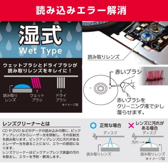 ●DVDレコーダー/ドライブ、Blue-rayレコーダー/ドライブのピックアップレンズクリーナー。 ●DVDが再生できる機種に対応しています。 ●2種類のマイクロファイバーブラシでクリーニング効果アップ。 ●クリーニングの仕組みが分かる実写映像が付いています。 ●5.1chのスピーカーシステムのチェック機能付き。 ●ウェットブラシとドライブラシが読み取りレンズをキレイにします ※ベースの盤はDVDですので、DVDが再生できないCD専用機/ブルーレイ専用機/ゲーム機には対応しません。 ※CD/DVD用とBlue-ray用で別々のピックアップレンズを持つレコーダー/ドライブでは、Blue-ray用のレンズはクリーニングはできません。 ※車搭載のプレーヤーおよびカーナビには使用しないでください。 ※液晶テレビなどに内蔵されているレコーダーには使用しないでください。 ※本製品のブラシ部には絶対に触れないでください。
