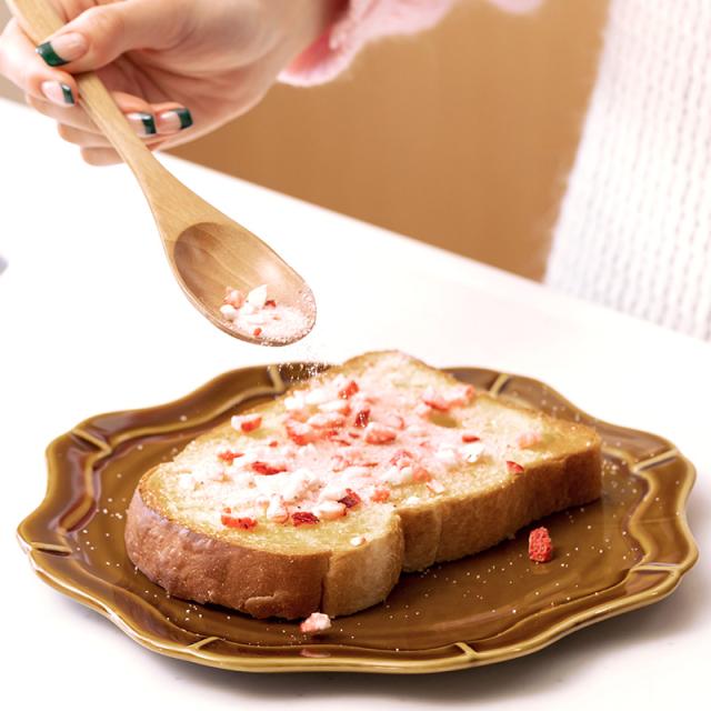 ヨーグルトにトッピングしたり、バターと混ぜてシュガートーストにしたり、ストレートの紅茶に入れていちごのフレーバーティーにしたりと、楽しみ方は色々。