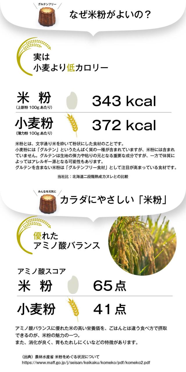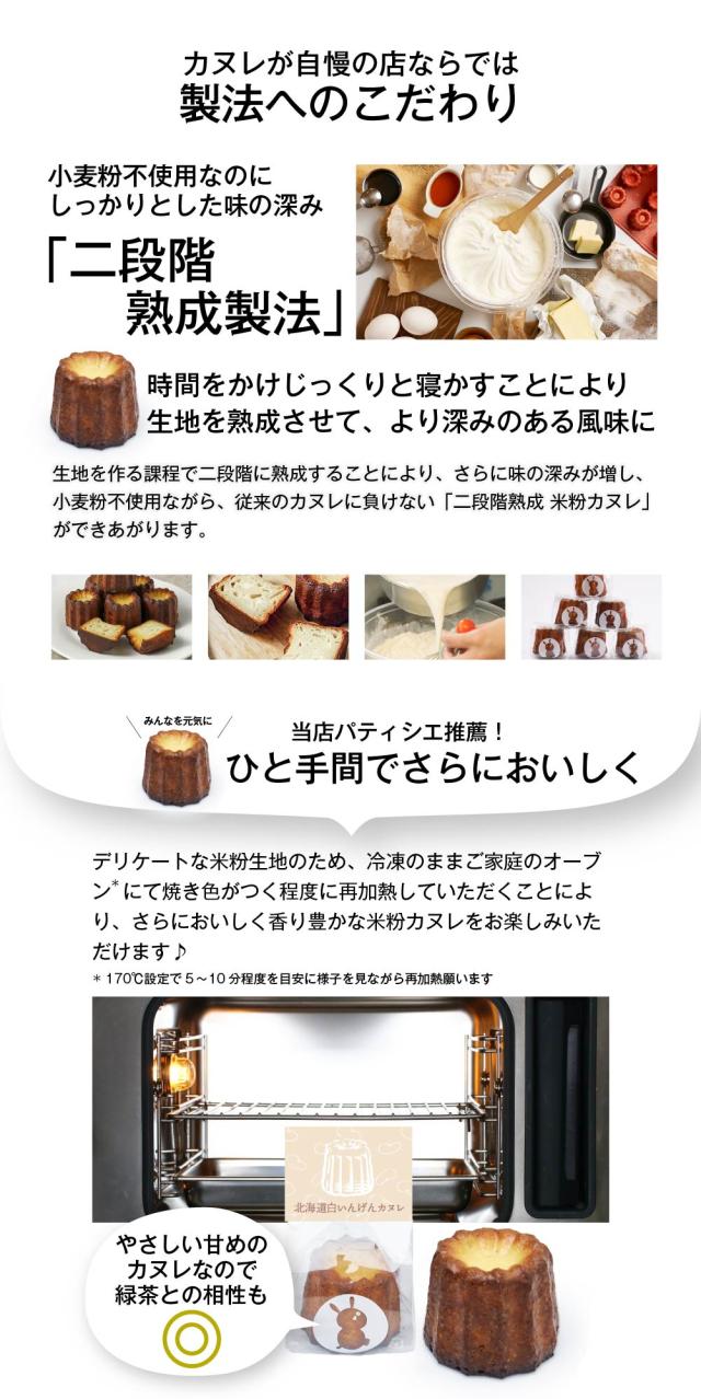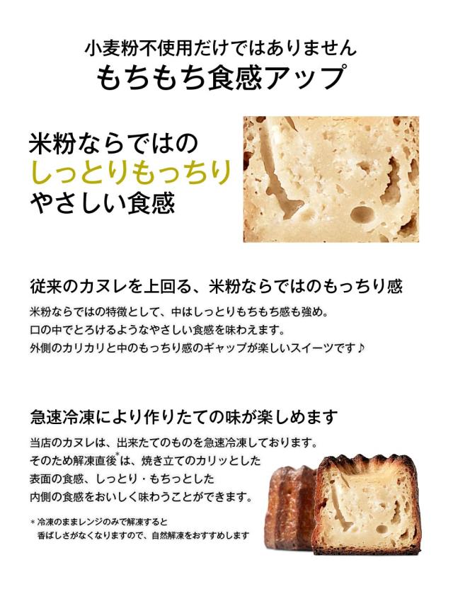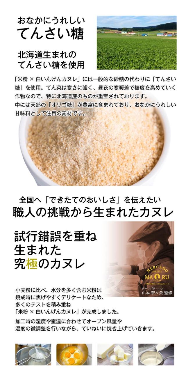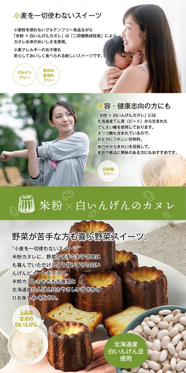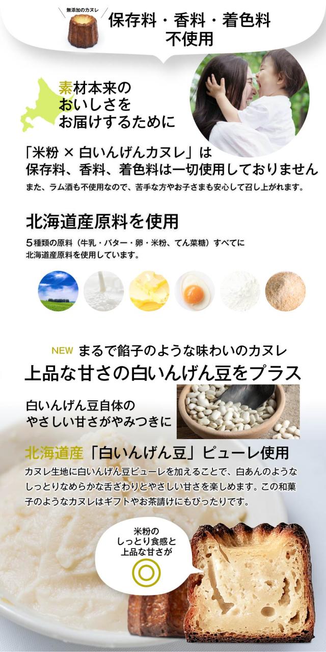 | 商品説明 | 北海道二段階熟成カヌレの『米粉×野菜』カヌレの第二弾! 今回は北海道産の白いんげんを当店のカヌレに組み合わせることにより、新たに「野菜カヌレ」が誕生致しました。 ■まるで餡子のような味わいのカヌレ 北海道産「白いんげん豆」ピューレ使用 カヌレ生地に白いんげん豆ピューレを加えることで、白あんのようなしっとりなめらかな舌ざわりとやさしい甘さを楽しめます。 この和菓子のようなカヌレはギフトやお茶請けにもぴったりです。 小麦粉不使用・ラム酒不使用、保存料等の添加物等も使用しておりません。甘味には「てんさい糖」を使用し、白いんげんの自然な甘みが感じられる味に仕上げました。 カヌレ本来のもちもちとした食感と、風味豊かな『白いんげん』のコラボレーションを是非お試しください。 |