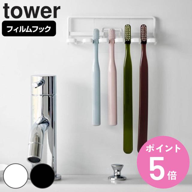 tower 山崎実業 フィルムフック 歯ブラシホルダー タワー 5連 ( タワーシリーズ 歯ブラシスタンド 歯ブラシフック 吸着 フック 掛け 貼って剥がせる 壁面 収納 洗面所 洗面台 風呂 )