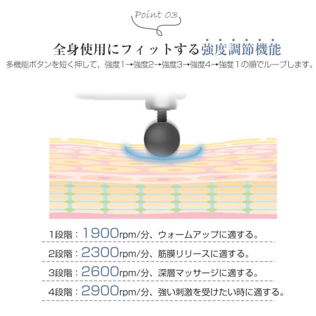 2.振動強度は1900rpm/分から2900rpm/分まで4段階で調節可能。