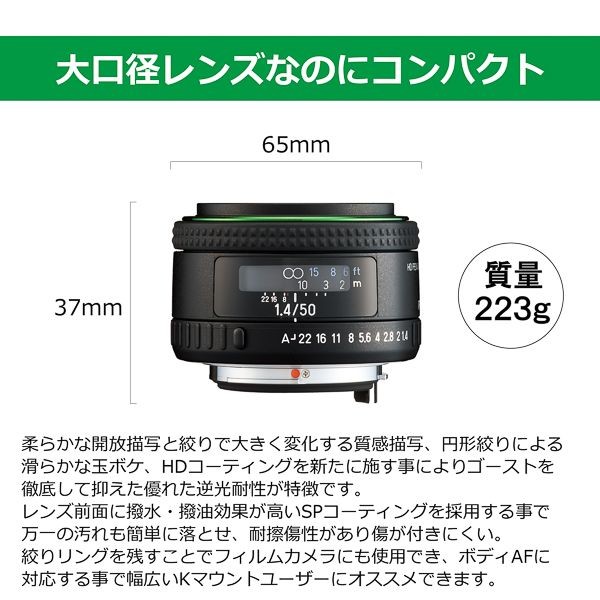 ペンタックスのデジタル一眼カメラに装着すると、フルサイズで50mmの標準レンズ、APS-Cサイズで35ミリ判換算76.5mm相当の中望遠画角が得られます。フルサイズでは人の視野に近い画角で撮影できる標準レンズとして、スナップや風景、ポートレートなど、さまざまな被写体に最適な一本です。