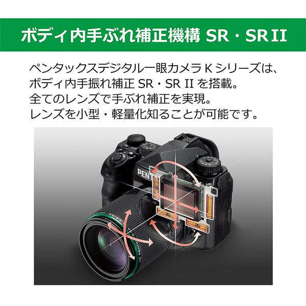 レンズ側での絞り設定や、ボディ内モーターによるAFに対応した仕様とすることで、旧製品のKマウントデジタル一眼カメラやAFフィルム一眼レフカメラ等への装着時に各機能が利用可能。