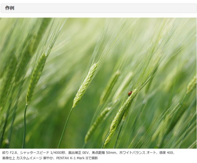 ●焦点距離 50mm35ミリ判換算値 76.5mm相当(ペンタックス APS-Cサイズ一眼レフカメラ装着時)