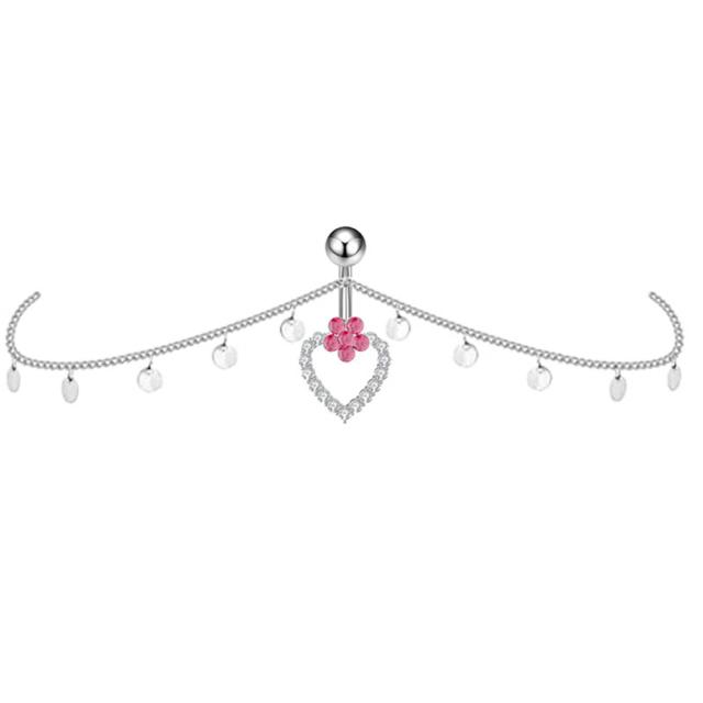 [14G ボディピアス] フラワーハートへそピアス(ウエストチェーン付) 14ゲージ ボディチェーン ビキニ 水着 鎖 臍ピアス ヘソピアス シルバー 銀色 ベリーダンス メンズ レディース プレゼント 揺れる ジルコニア キラキラ 石付き ストーン ジュエル ピンク 花 ラウンド