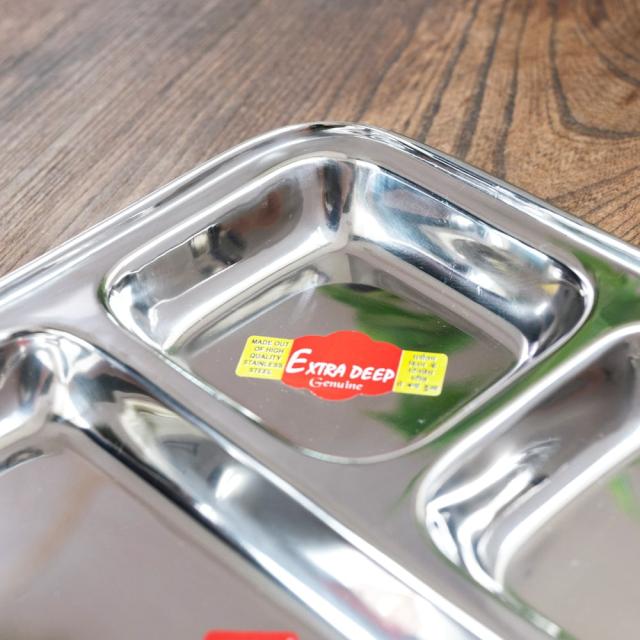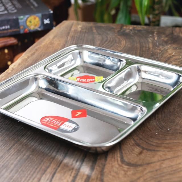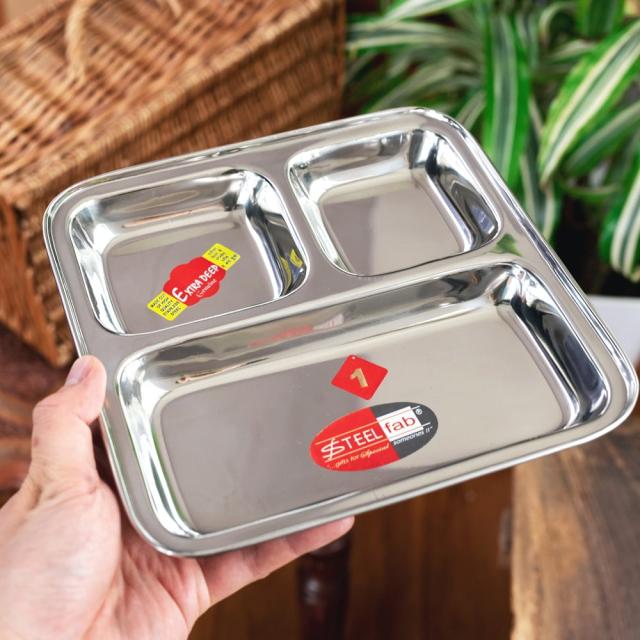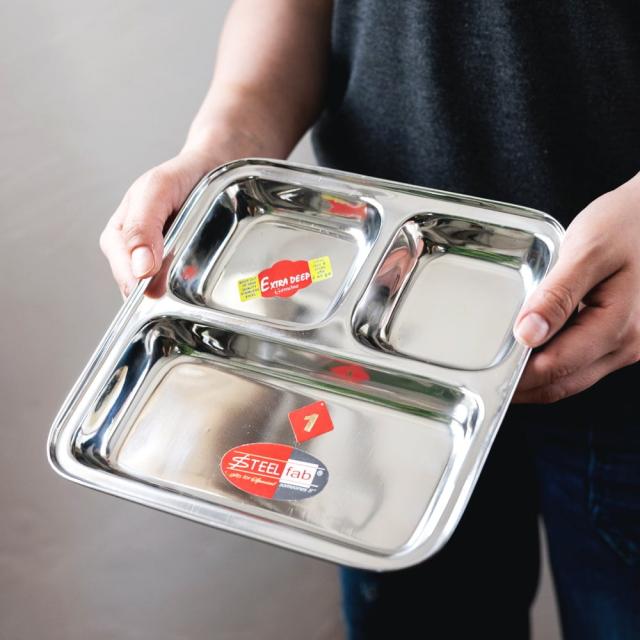 インドでカレーを食べるときに使うステンレス製のランチプレート。ランチプレートが分割されているので、一番広いところにご飯を入れ、小皿の中にカレーなどを入れて使用します。もちろん、カレー以外の食器としてもオススメ。落としても壊れないので、丈夫さも魅力です。