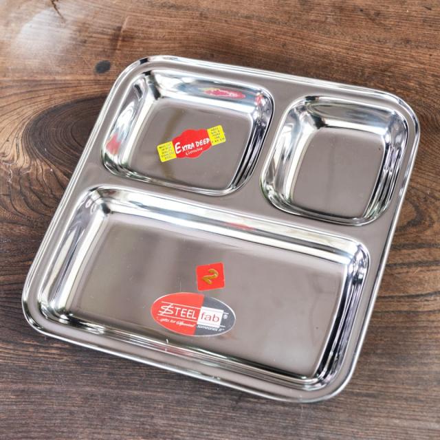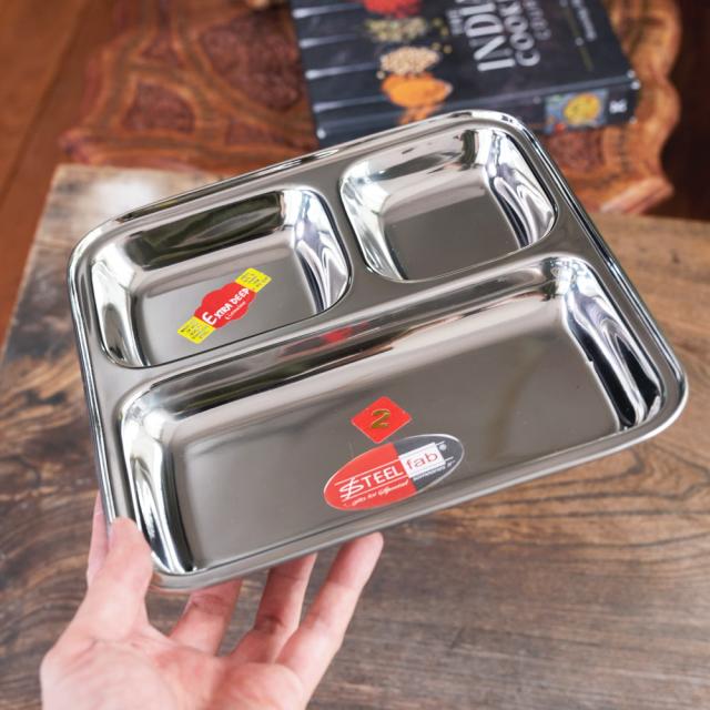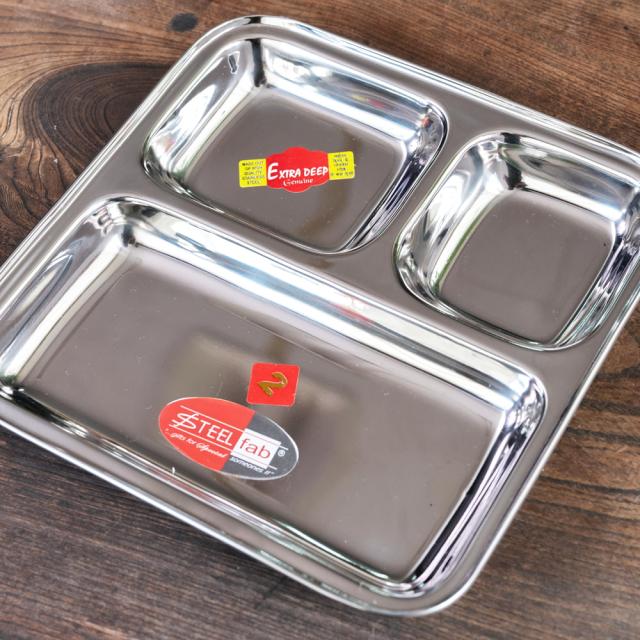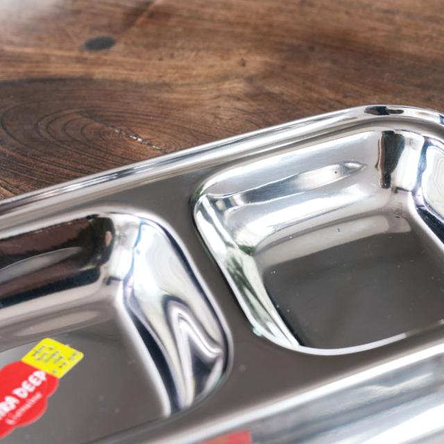 インドでカレーを食べるときに使うステンレス製のランチプレート。ランチプレートが分割されているので、一番広いところにご飯を入れ、小皿の中にカレーなどを入れて使用します。もちろん、カレー以外の食器としてもオススメ。落としても壊れないので、丈夫さも魅力です。