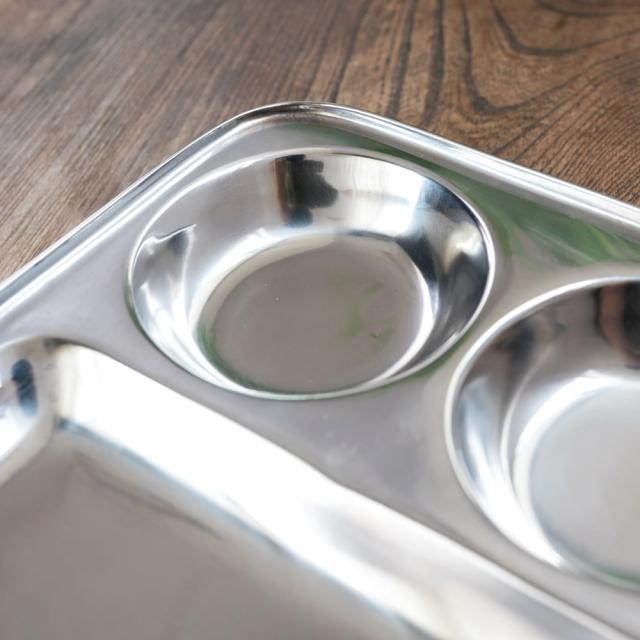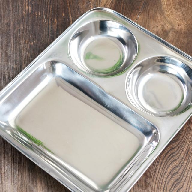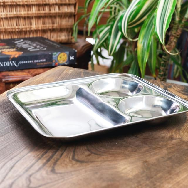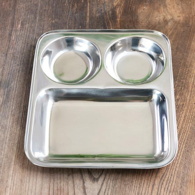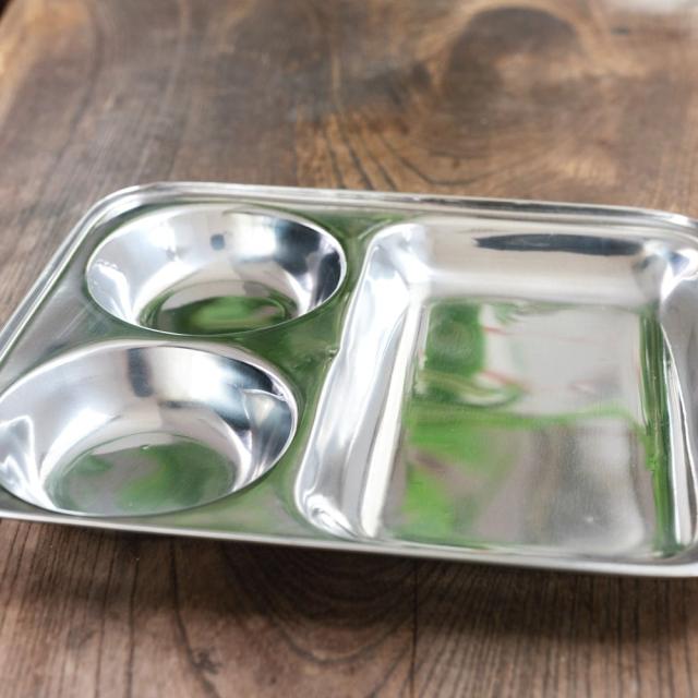 インドでカレーを食べるときに使うステンレス製のランチプレート。ランチプレートが分割されているので、一番広いところにご飯を入れ、小皿の中にカレーなどを入れて使用します。もちろん、カレー以外の食器としてもオススメ。落としても壊れないので、丈夫さも魅力です。