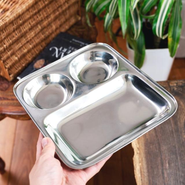 3分割ランチプレート 【四角】 約26.2cm x 約23cm / インド料理、インドカレー、カレー 皿、ランチプレート、分割 カレー皿、インドカレー、 インド料理、 ターリー皿、 インドカレー皿、 ステンレスカレー皿、 仕切りプレート、 カレープレート、 インド食器、 エスニック食器、 業務用カレー皿 インド アジアの食材 【インドとアジアン食品・食材