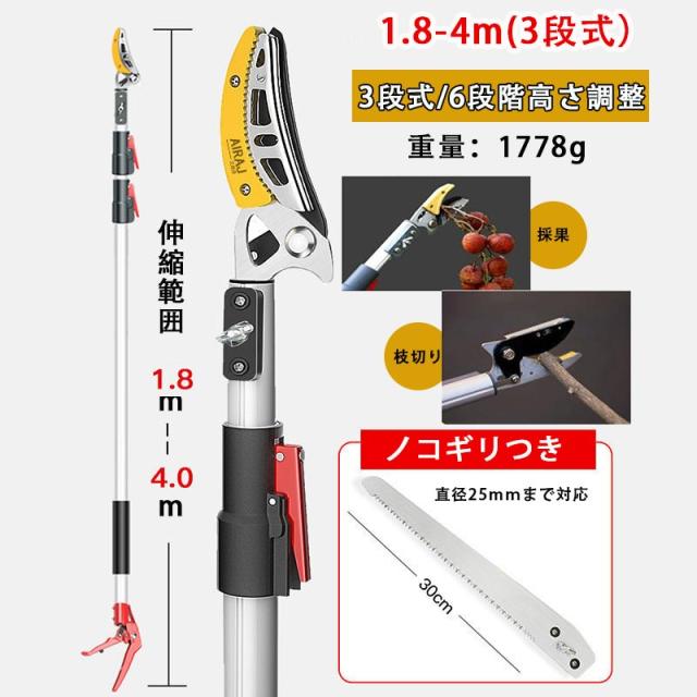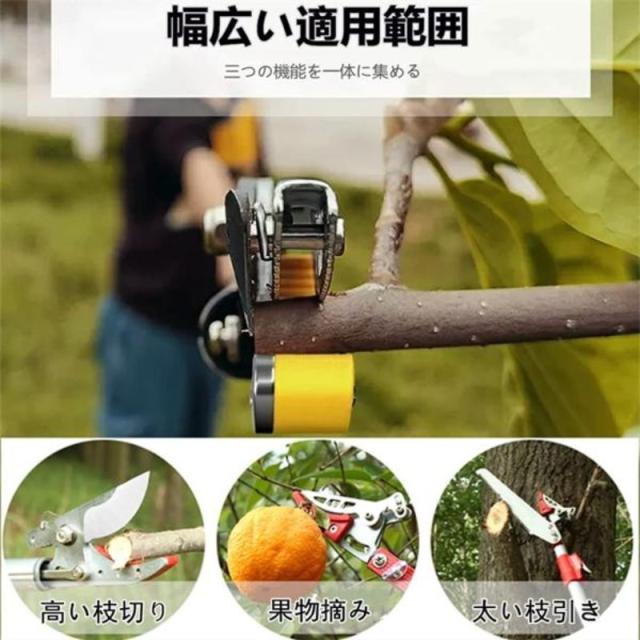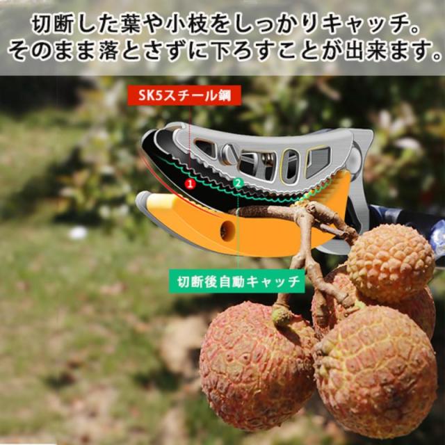 【操作が簡単】キャッチ機能が付いているため、カットした枝や果実を落とさず掴んだまま回収できます。波形の固定設計、安定性が大幅に向上し、作業の効率も向上します。そのほか、専用ノコギリ付き、太い枝も切れる。多くの果物の摘み取りに適している。