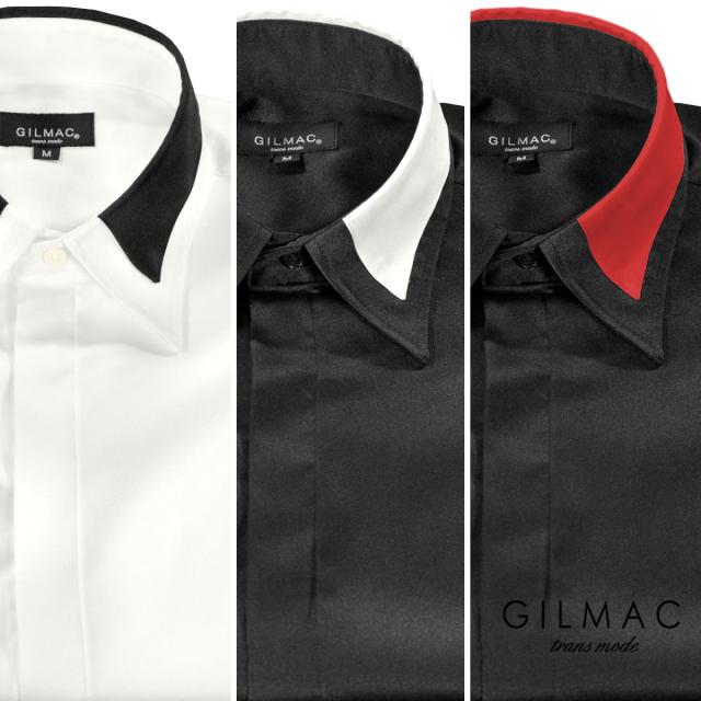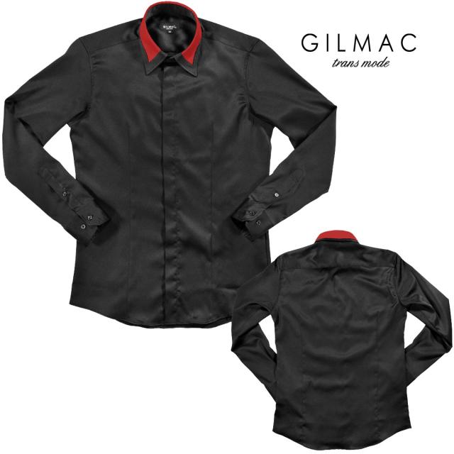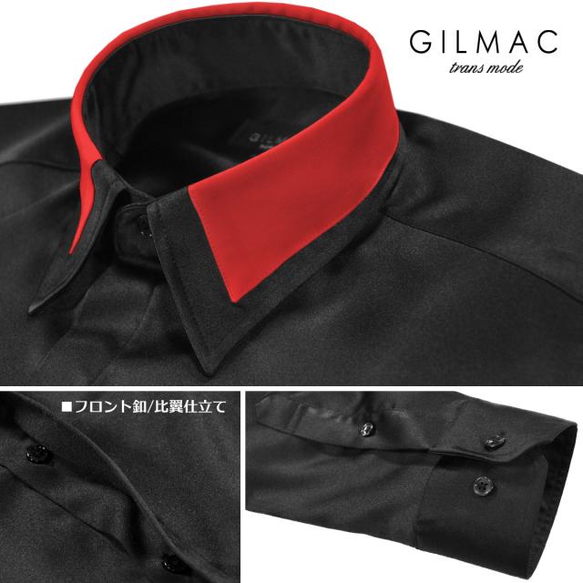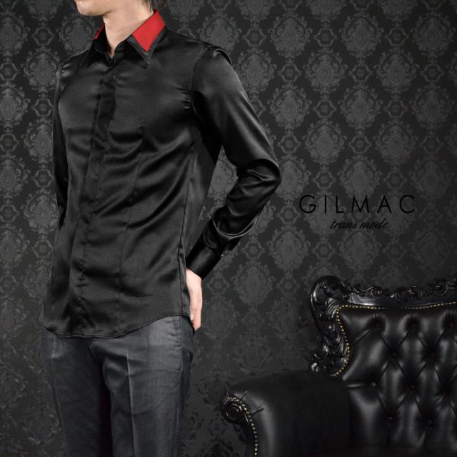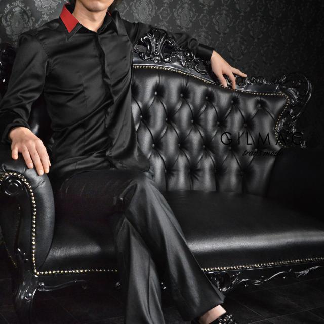 ドレスシャツ サテンシャツ 襟 切り替え レギュラーカラー 無地 結婚式 パーティー(ブラック黒レッド赤) 36110