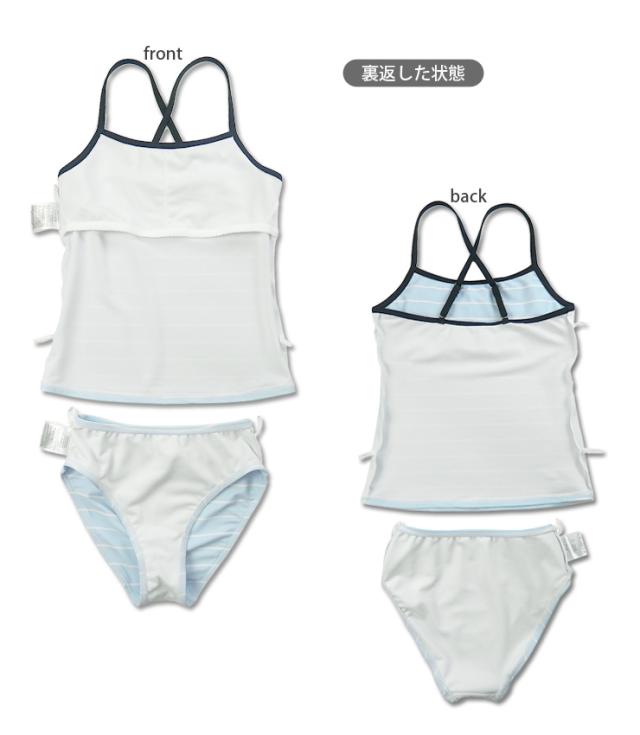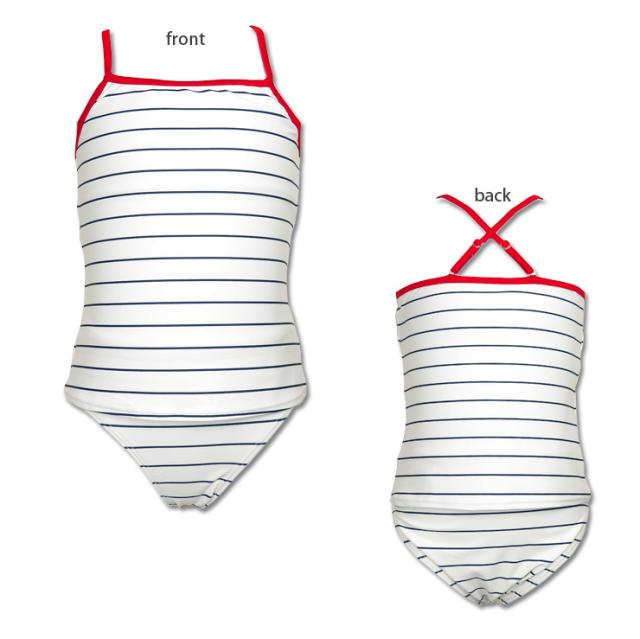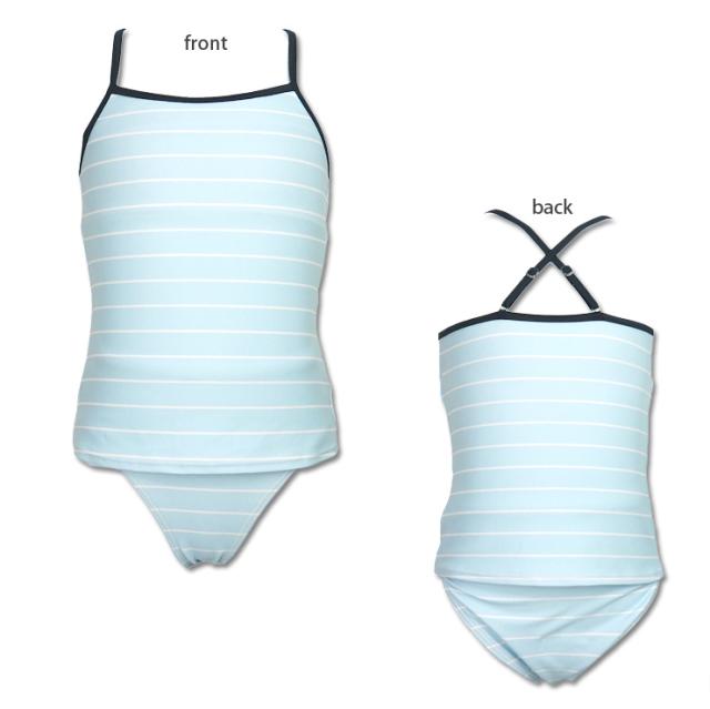 ボーダー柄のトップス、タンキニ上下と無地のショートパンツのセットです。