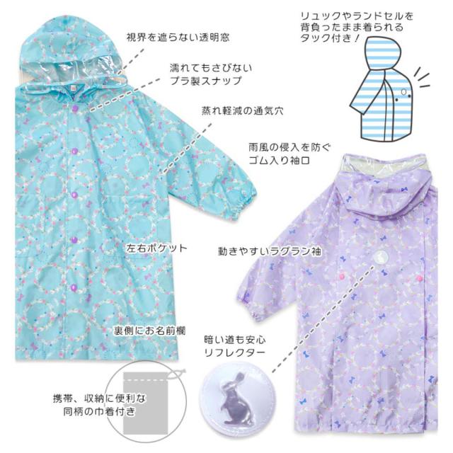 白い鳥とガーランドの組み合わせが可愛いレインコートです。ランドセルやリュックを背負ったまま着られるランドセルタック付きで、動きやすいラグラン袖なのでゆったり着ていただけます。