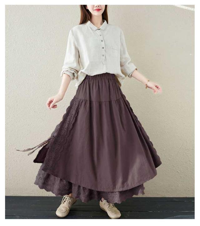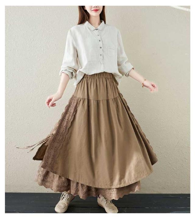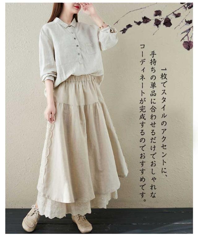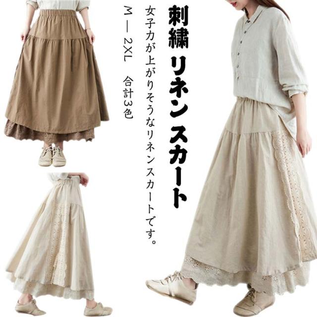 レイヤード風 スカート 刺繍 リネン スカート ロングスカート フレアスカート マキシスカート 春夏 リネンスカート ウエストゴム マキシ丈 ロング丈 ナチュラル Aライン 体型カバー M L XL 2XL