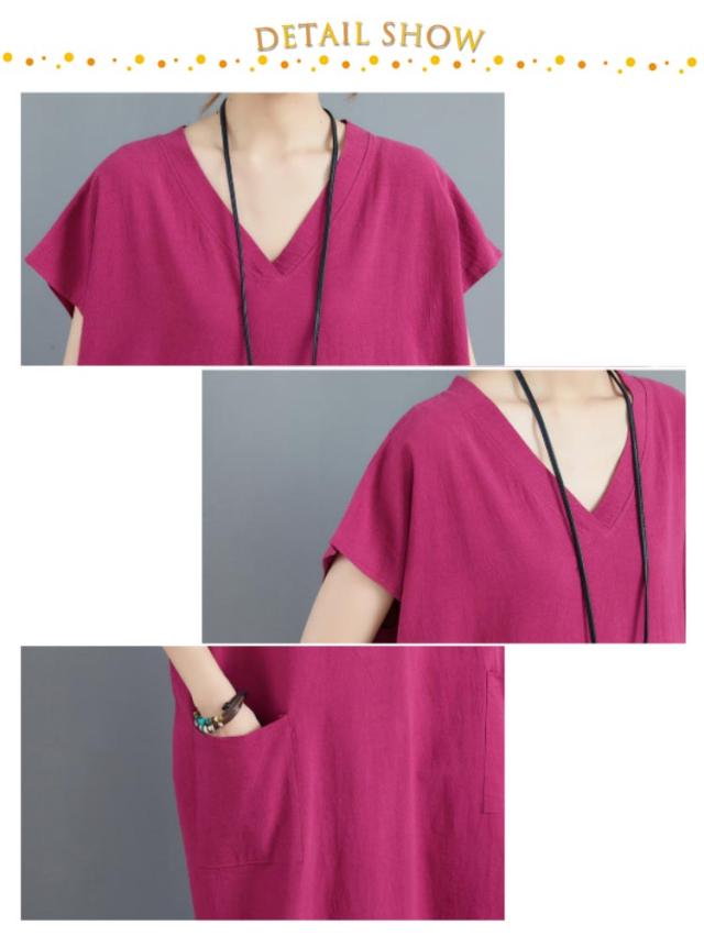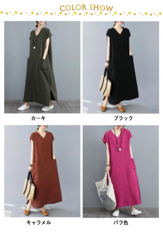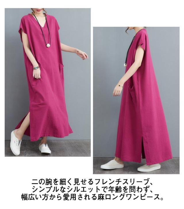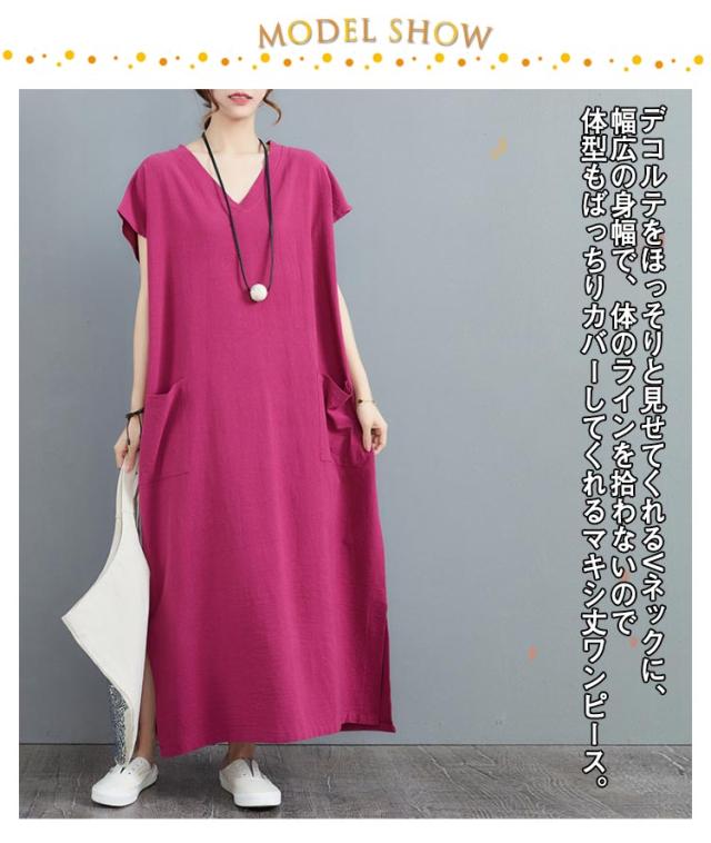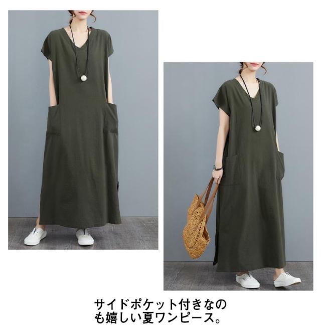 ロングワンピース スリット入り 大きいサイズ マキシワンピース 涼しい 半袖 フレンチスリーブ リネンワンピース コットンリネン Vネック ポケット付き 夏服 新作 ナチュラル ゆったり 体型カバー ワンピース