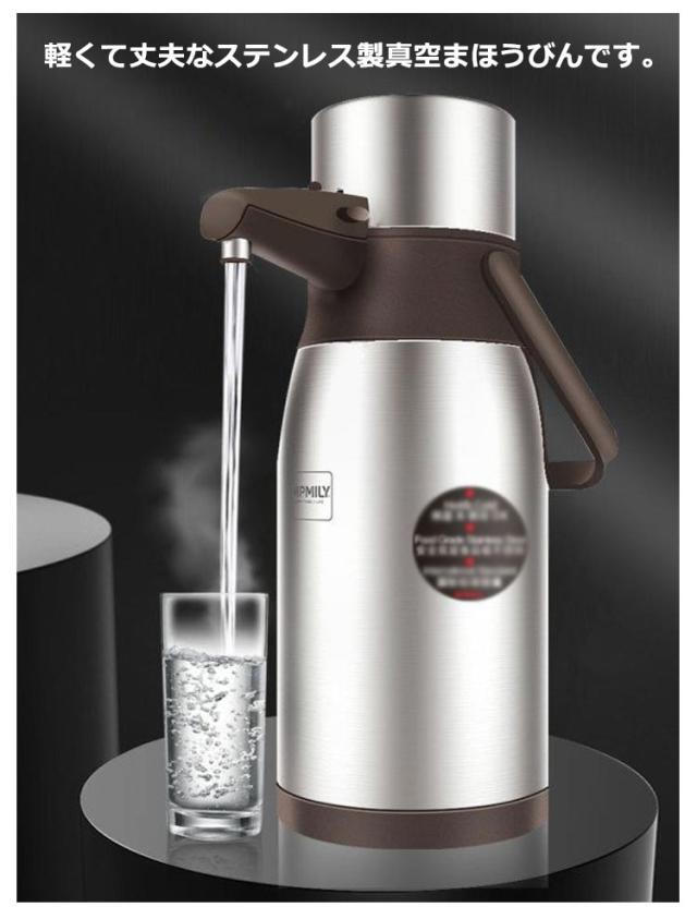 | 電気を使わず長時間温度をキープ!保温・保冷力抜群の魔法瓶 軽くて丈夫なステンレス製真空まほうびんです。 2重になった内容器の隙間に真空層をもうけることにより高い断熱効果を発揮し、暖かい飲み物も冷たい飲み物も温度を長時間キープします。 軽い力で押せるので、力の弱い方にもやさしい設計。また誤って押してしまわないようにロックが付いているので、小さなお子様やお年寄りのいるご家庭でも安心です。 取っ手付きなのでテーブルに運ぶのも楽ちんです。また使う場所を選ばないので、ピクニックやキャンプなどのアウトドアへも気軽に持ち出せます。 落ち着きと上質感のあるステンレスボディは衝撃に強く、汚れてもサッとふき取れる実用性を兼ね備えています。 | |