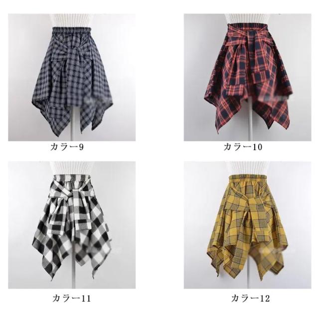 ミニスカート レディース シャツスカート チェック柄 シャツ腰巻き風スカート 不規則 付け裾 レイヤード 全12色 ミニ スカート ウエストゴム お尻が隠れる ストレート 団体 ダンス 発表会 稽古 ダンス ダンススカート jazz hip-hop