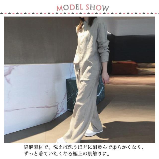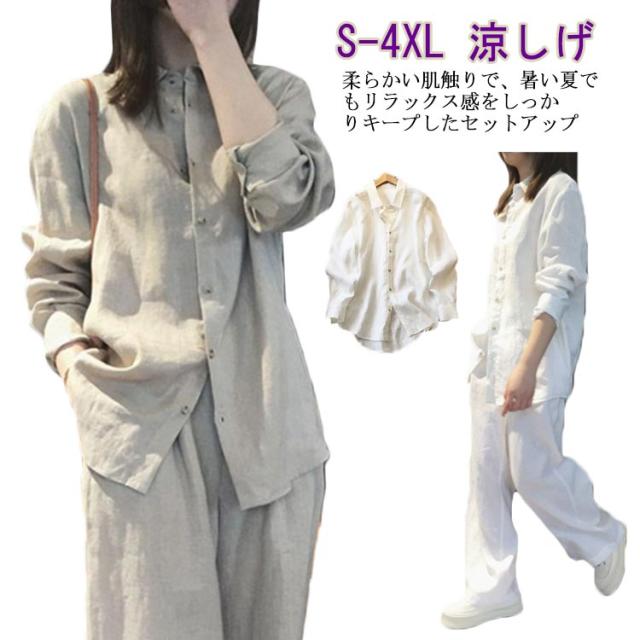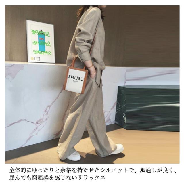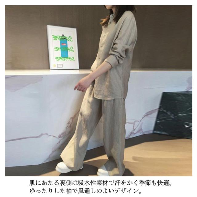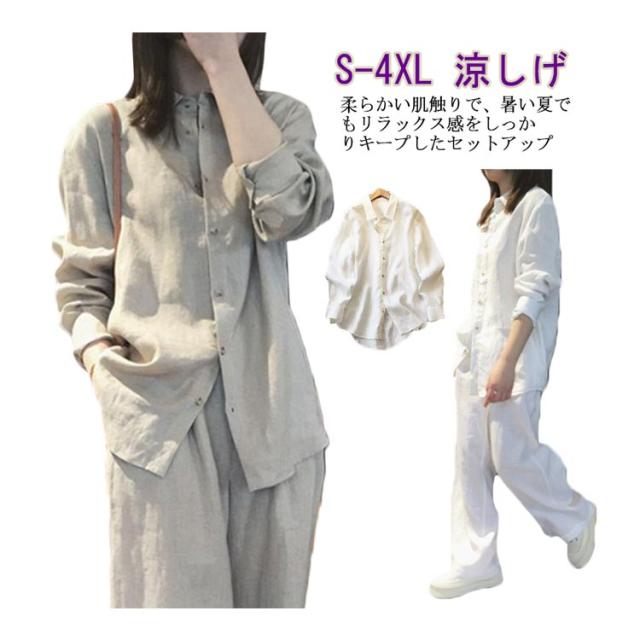 レディース シャツ ブラウス セットアップ リネン 長袖 ルームウェア ガウチョパンツ 夏 ワイドパンツ ひんやり 接触 冷感 上下セット リネンパンツ ボトムス 春夏 春 涼しげ ナチュラル ゆったり おしゃれ 体型カバー 着痩せ 部屋着 通勤 30代 40代 50代 送料無料