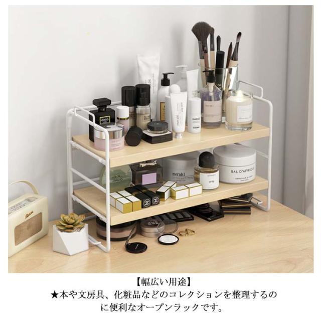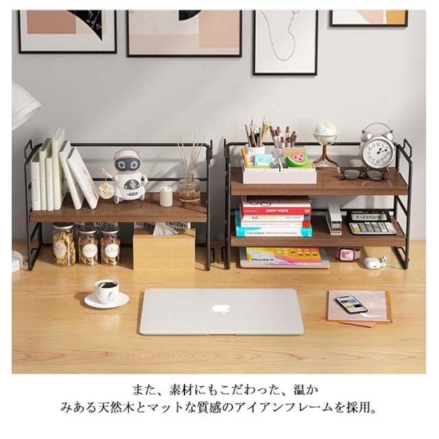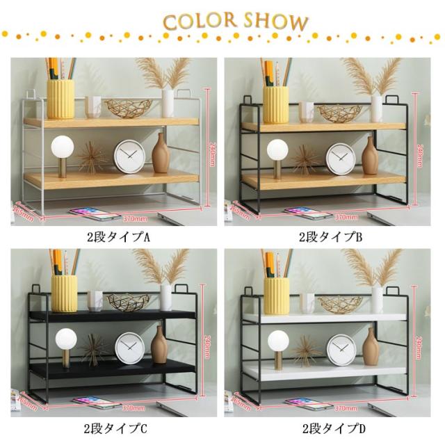 | 選べる1段式・2段式!棚板の高さ調整が出来る卓上ラック。 棚板の高さは4段階に調節が出来るから、高いものも簡単に収納することができます。 また、素材にもこだわった、温かみある天然木とマットな質感のアイアンフレームを採用。 北欧スタイルに変えてくれるデザイン、大人な部屋を演出! 【幅広い用途】 ★本や文房具、化粧品などのコレクションを整理するのに便利なオープンラックです。 ★キッチンに調味料の収納として使用にも大便利! ★いろんな場所に使用できて様々のニーズに満足できる上品卓上収納ラック! | |