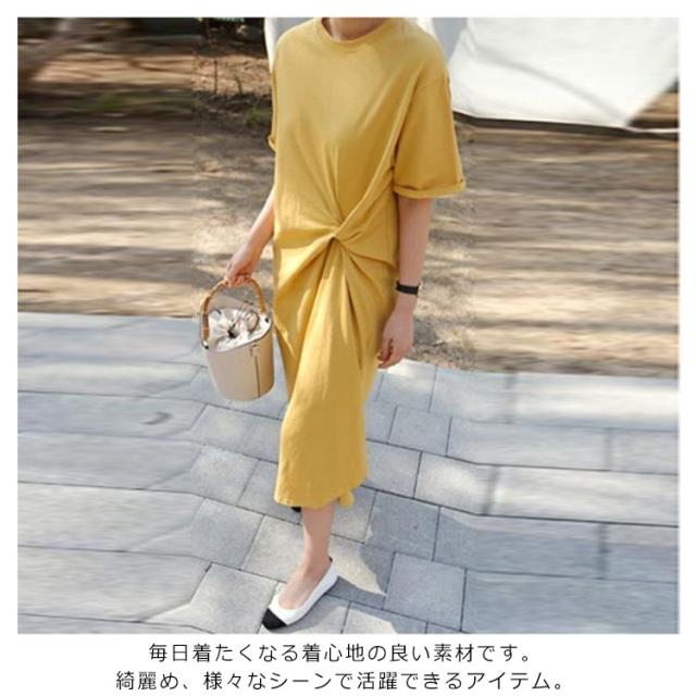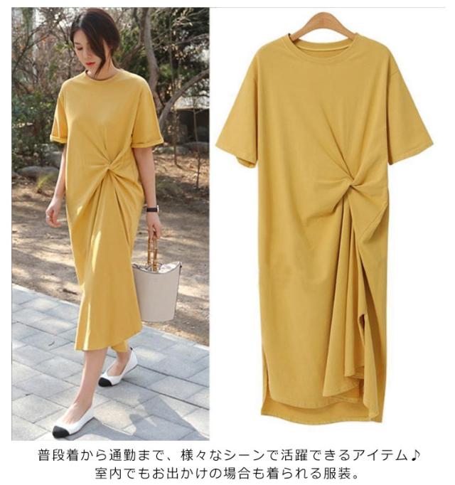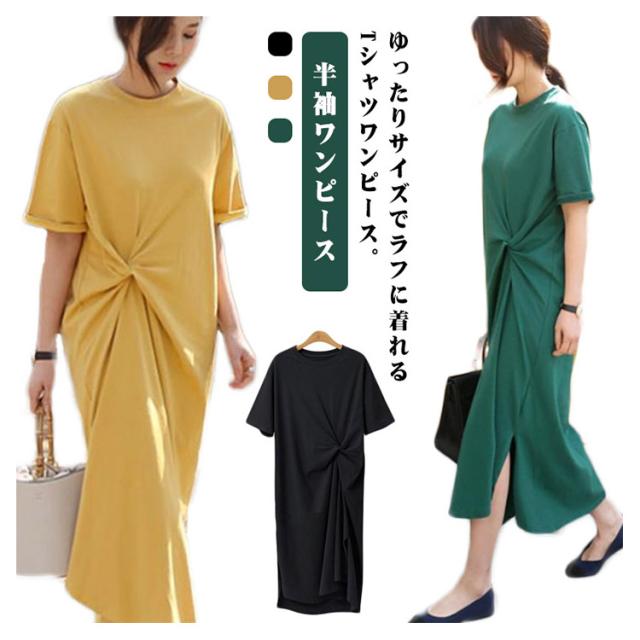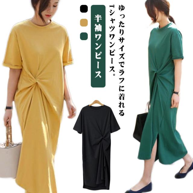 半袖ワンピース ロングワンピース Tシャツワンピース アシメ ワンピース Aライン ギャザーデザイン 着やせ 体型カバー マキシ丈 ミモレワンピース 春 夏 レディース ゆったり 大きいサイズ フェミニン カジュアル 部屋着 ブラック イエロー グリーン 送料無料 M-3XL