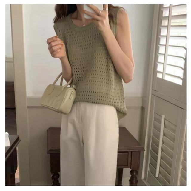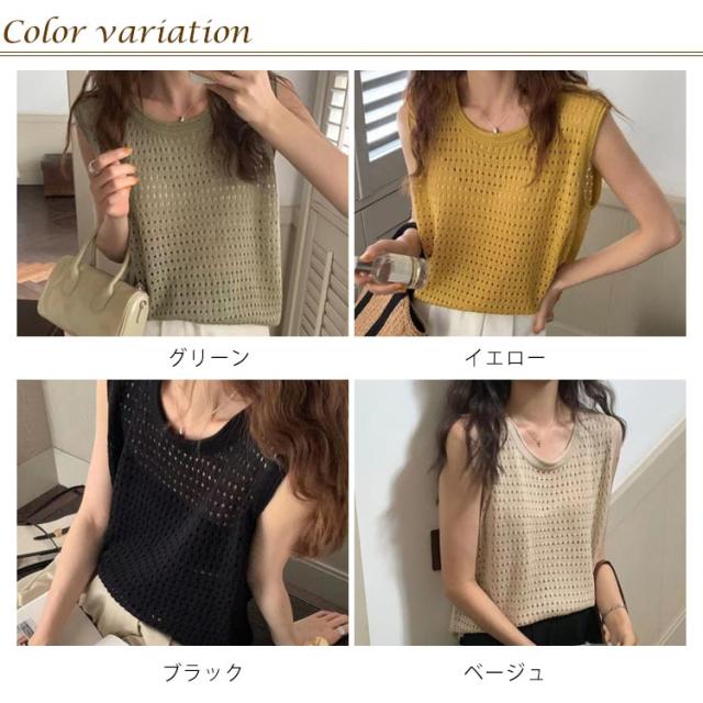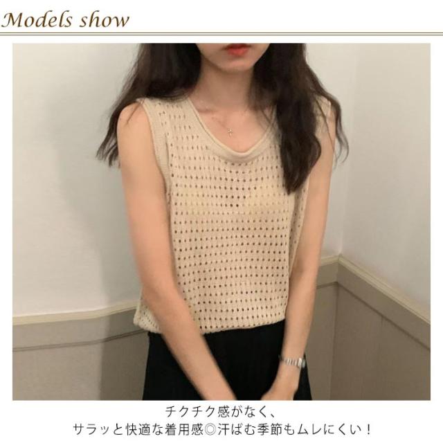 送料無料 サマーニット 透かし編み ノースリーブ リブニット レディース タンクトップ ニット tシャツノースリーブ カットソー Uネック 袖なし シンプル きれいめ カジュアル おしゃれ セクシー かわいい 通勤 オフィス