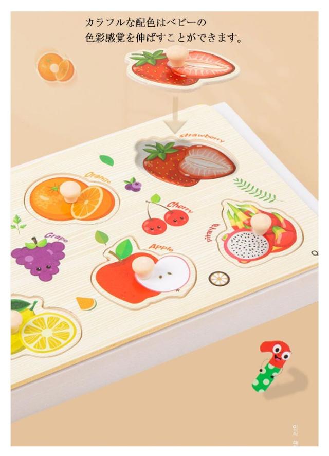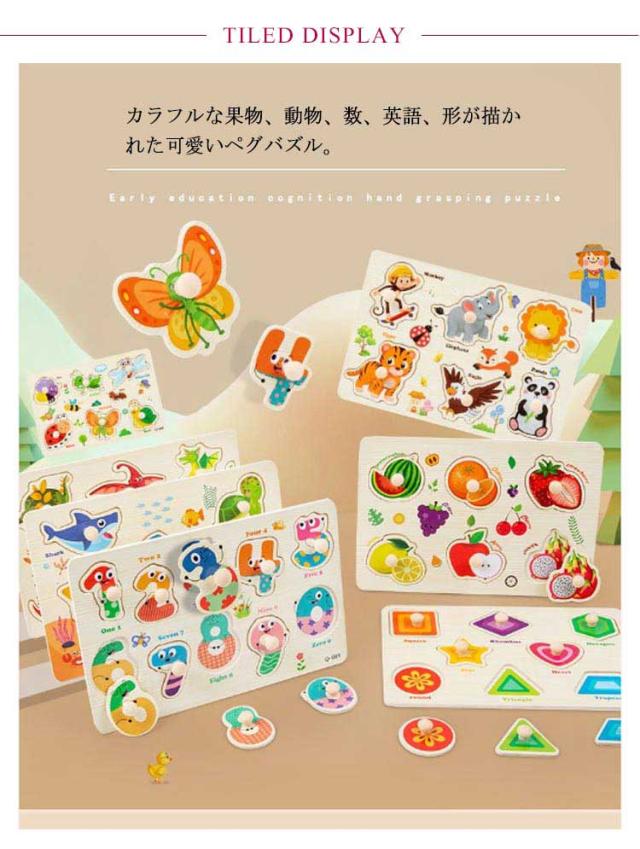 | 【取っ手つき木製パズル5点セット】 カラフルな果物、動物、数、英語、形が描かれた可愛いペグバズル。 手触りが優しく安全な木材と天然塗料を使用しています。 取っ手つきで遊びやすく楽しみながら形や物の名前などを理解していきます。 カラフルな配色はベビーの色彩感覚を伸ばすことができます。 指先を使うことで脳が刺激され遊びながら様々な知育効果が期待できます。 誕生日、クリスマス、入園祝い、入学祝い、新年などににもぴったり。 | |