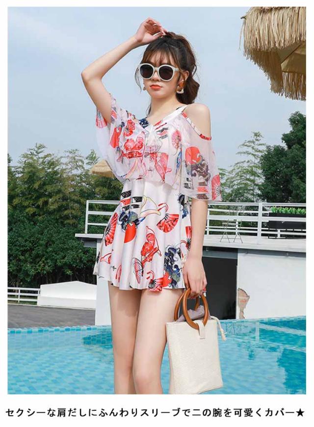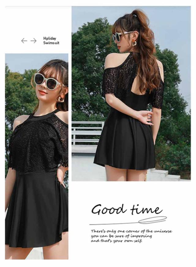 ワンピース 水着 体型カバー レディース ママ水着 オフショルダー オールインワン 体型カバー水着 ワンピース水着 黒 露出控えめ ぽっちゃり 女性 大人女子 フレアスカート 可愛い お洒落 二の腕 お腹 胸元 お尻 太もも カバーアップ みずぎ ミズギ