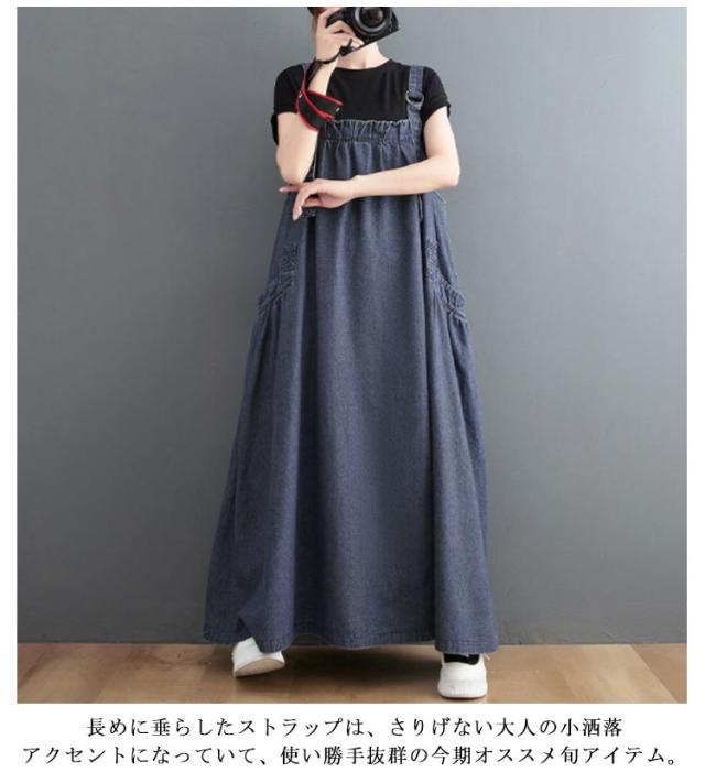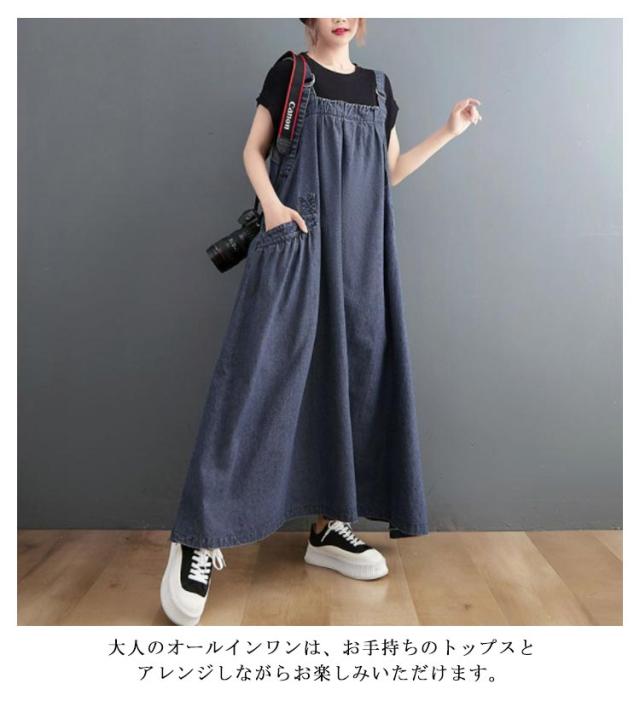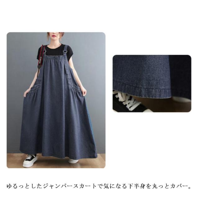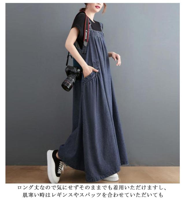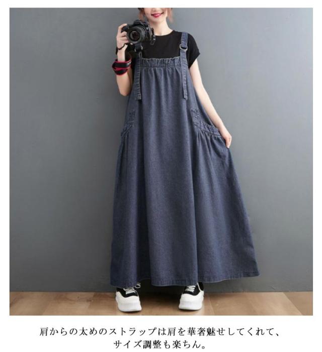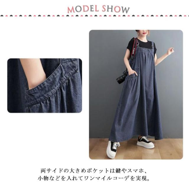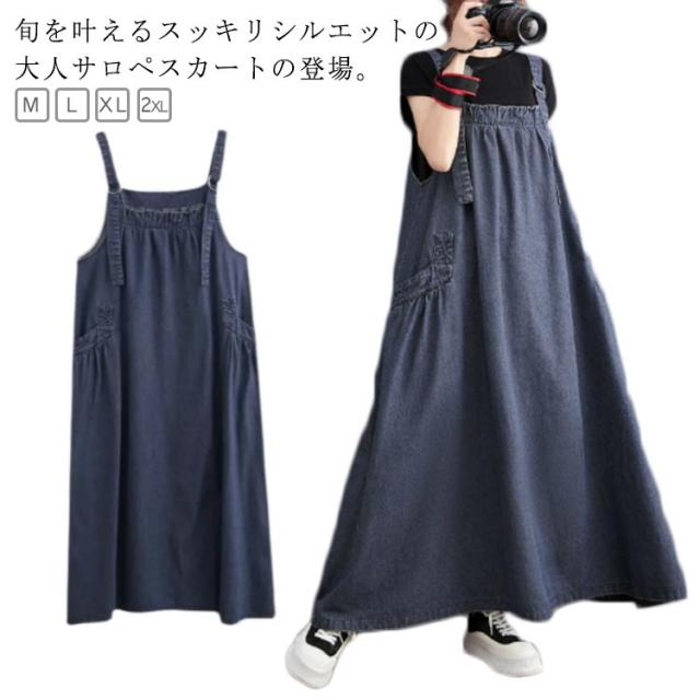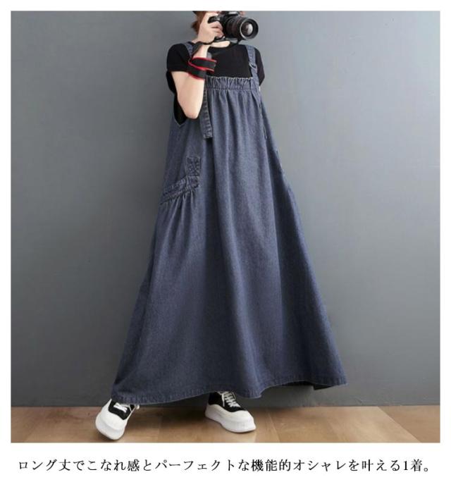 ジャンパースカート デニム デニムワンピース サロペット 大きいサイズ ロング マキシワンピース 春 秋 ロング丈 ジャンスカー デニムワンピ ポケット付き ワンピ オーバーサイズ オールインワン 体型カバー ゆったり Aライン 送料無料