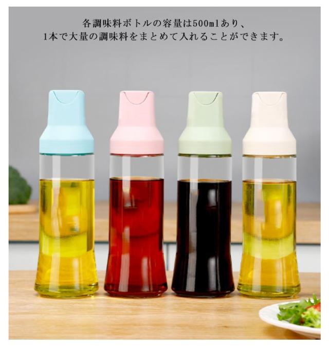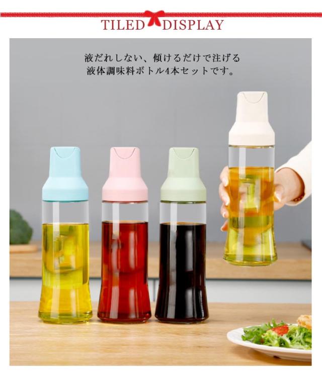 | 【4個セット】【500ml】【送料無料】【漏れ防止】 液だれしない、傾けるだけで注げる液体調味料ボトル4本セットです。 各調味料ボトルの容量は500mlあり、1本で大量の調味料をまとめて入れることができます。 傾けるだけで自動で蓋が開く。調味料の液漏れを防止するためにシリコンシールでしっかりと密閉します。 ガラス瓶の口が大きく、詰め替えが簡単なので、経済的かつ環境に優しい使い方ができます。 オシャレなデザインで、キッチンに置いておくだけでもインテリアになるアイテムです。 パッキン付きで密閉されているので、倒してしまってもこぼれることなく安心です。 | |