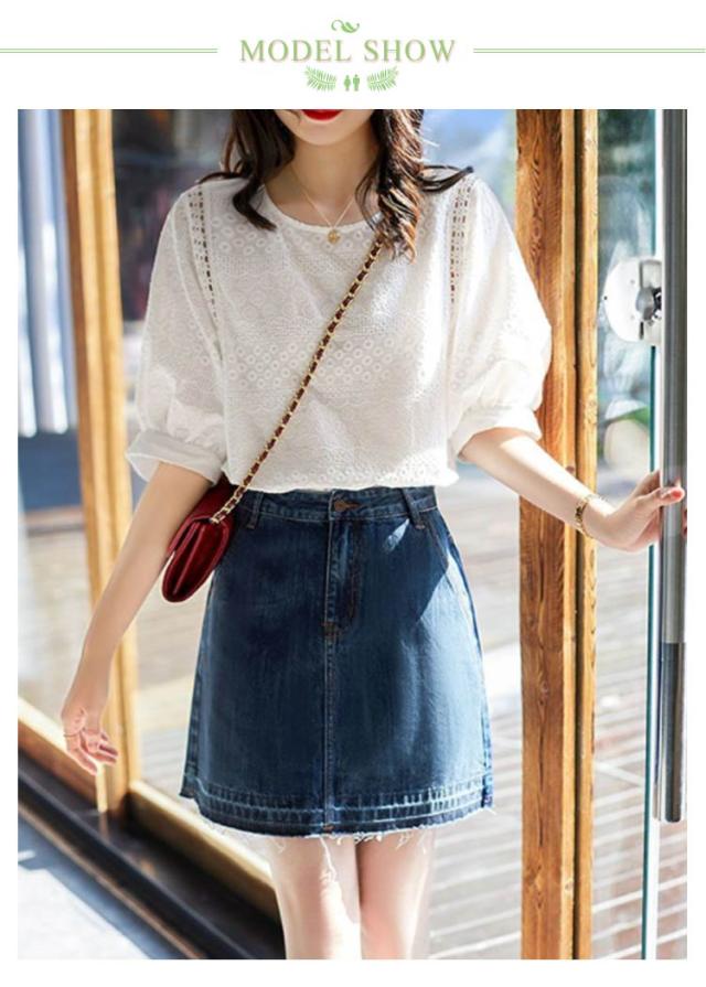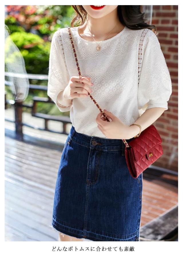 ブラウス レディース 半袖 パフスリーブ トップス 送料無料 シャツブラウス プルオーバー 五分袖 クルーネック 大きいサイズ ゆったり コットン 刺繍 刺しゅう 夏 シンプル おしゃれ 白 ホワイト