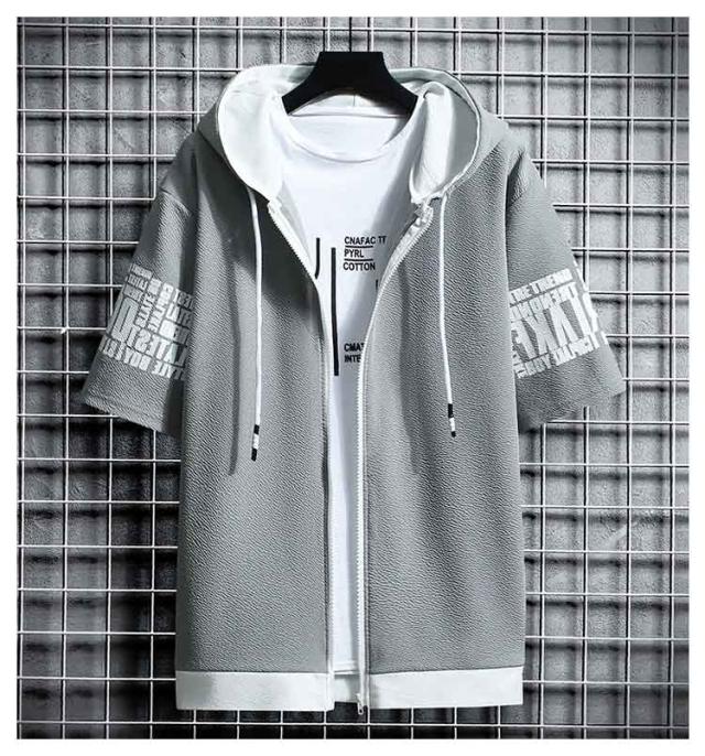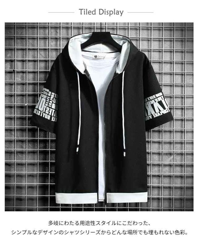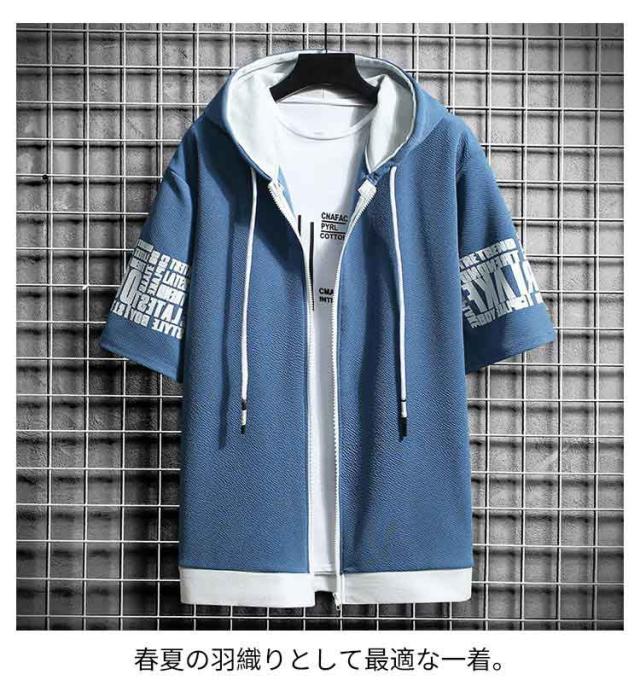半袖パーカー メンズ 半袖 切り替え パーカー フード付き ジップアップ 前開き 薄手 トップス パーカ 文字 プリント 肌触り 冷感 重ね着 カジュアル 夏物 春 夏 秋 運動着 部屋着 ルームウェア スポーツウェア メンズファッション S-3XL