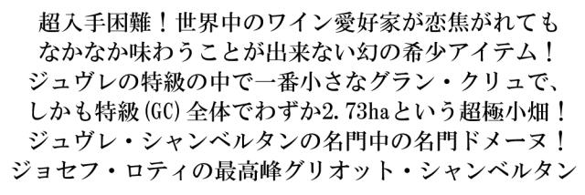超入手困難!世界中のワイン愛好家が恋焦がれても なかなか味わうことが出来ない幻の希少アイテム! ジュヴレの特級の中で一番小さなグラン・クリュで、 しかも特級(GC)全体でわずか2.73haという超極小畑! ジュヴレ・シャンベルタンの名門中の名門ドメーヌ!ジョセフ・ロティの最高峰グリオット・シャンベルタン■さまざまなギフトアイテムをご用意しております。お中元 ギフト 御中元 お盆 お礼 敬老の日 クリスマス 冬ギフト お歳暮 御歳暮 お年賀 御年賀 お正月 年末年始 ご挨拶 バレンタイン ホワイトデー お返し 父の日 母の日 ギフト 贈答品 お土産 手土産 御祝 御礼 内祝い 引き出物 お祝い 結婚祝い 結婚内祝い 出産祝い 出産内祝い 引き菓子 快気祝い 快気内祝い 進学祝い 誕生日祝い バースデーケーキ プレゼント Wedding ウェディング ホームパーティ お花見 パーティ 退職ギフト 退職 就任祝い