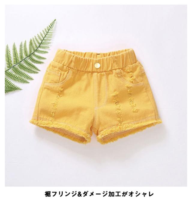 | 【選べる9色!】 【100cm 〜 150cm】 かわいいデニムショートパンツ 裾フリンジ&ダメージ加工がオシャレ ウエストがゴムなので楽ちんです。 カラー、サイズ展開豊富なので毎日違うコーデを楽しめます。 | |