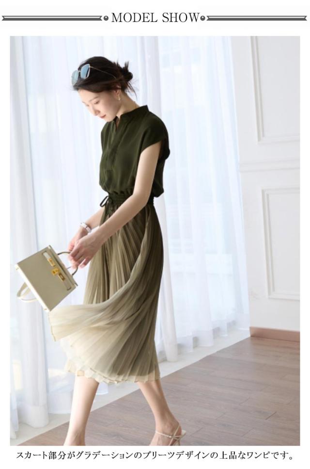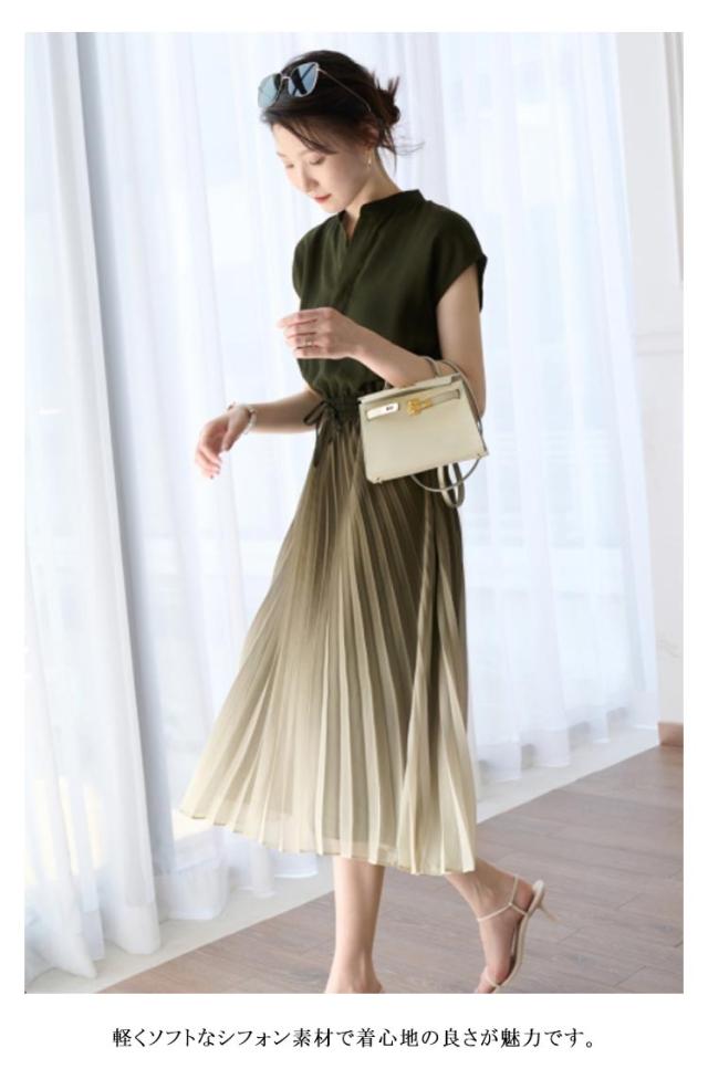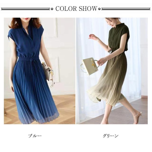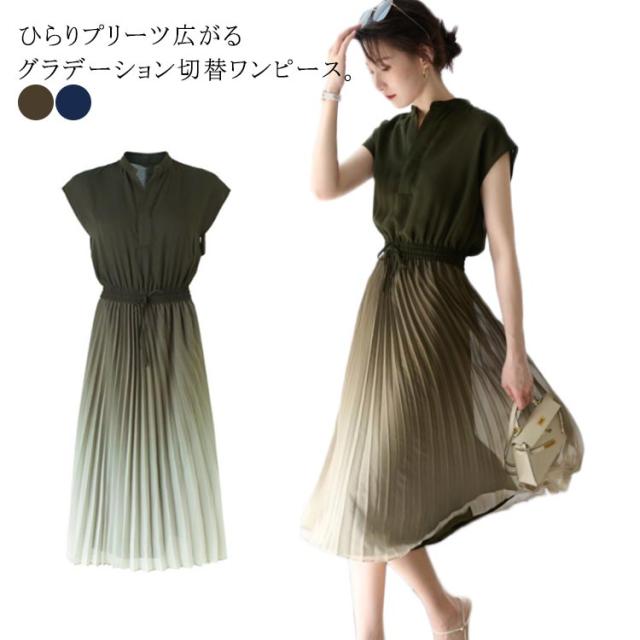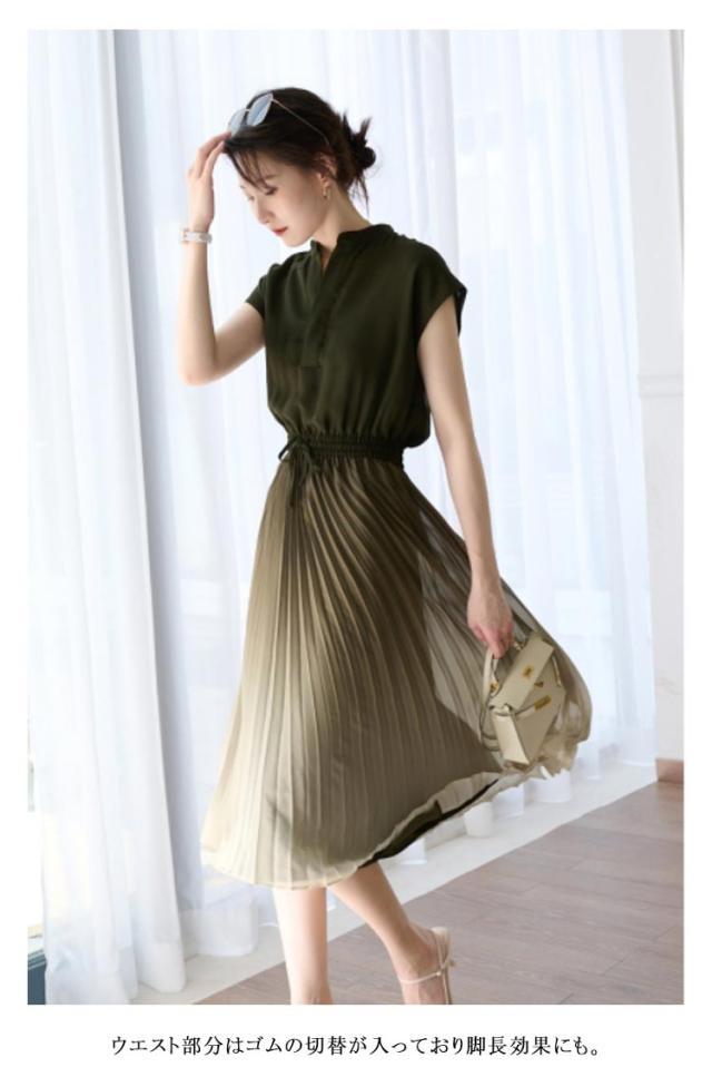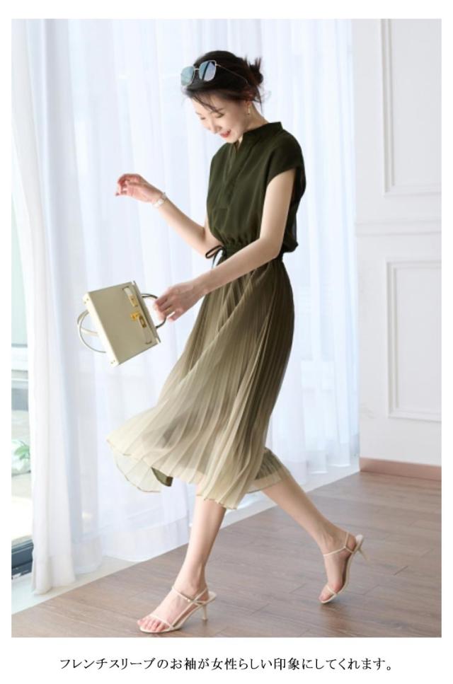 レディース グラデーション 体型カバー ワンピース 揺れる プリーツワンピース 夏 切替 フレンチスリーブ ウェストゴム Aライン ロング丈 大人 可愛い お出かけ きれいめ おしゃれ 上品 オフィス 通勤 入園式 卒業式 大きいサイズ バンドカラー