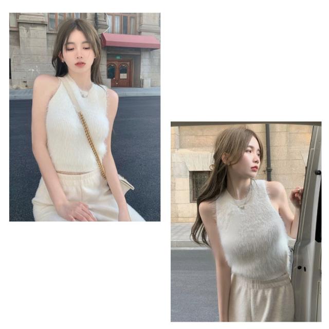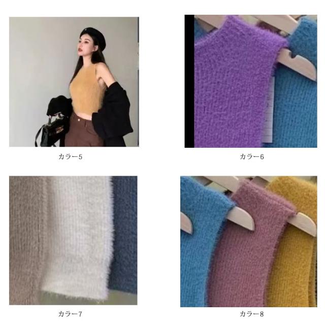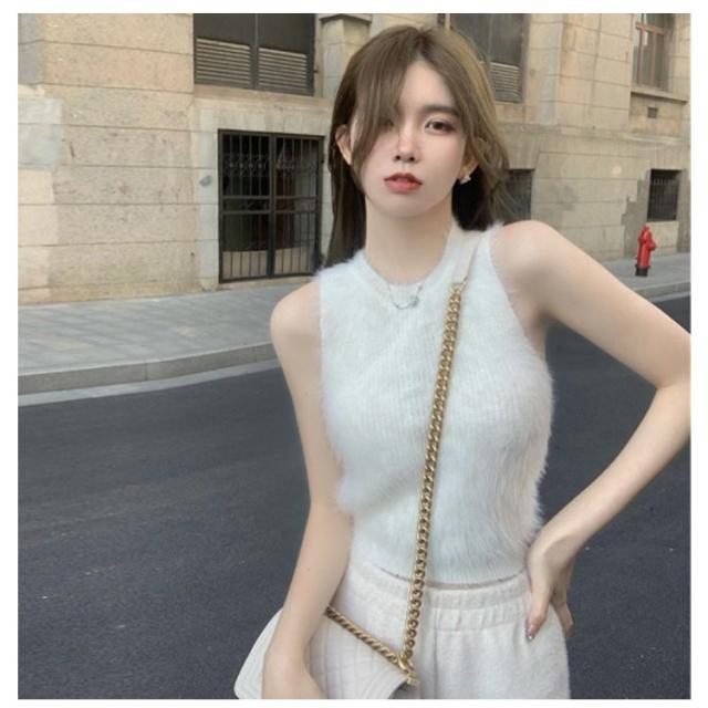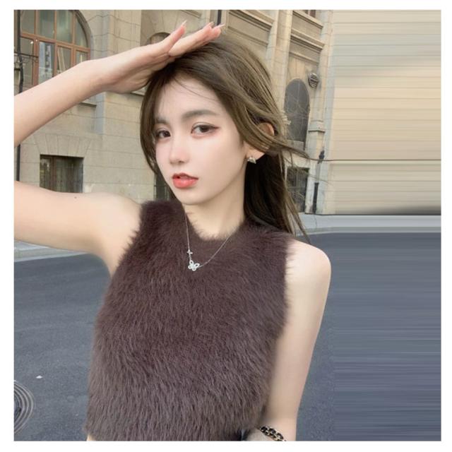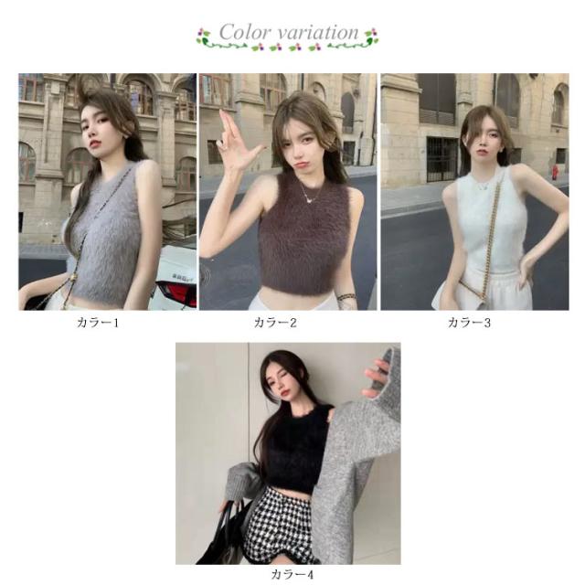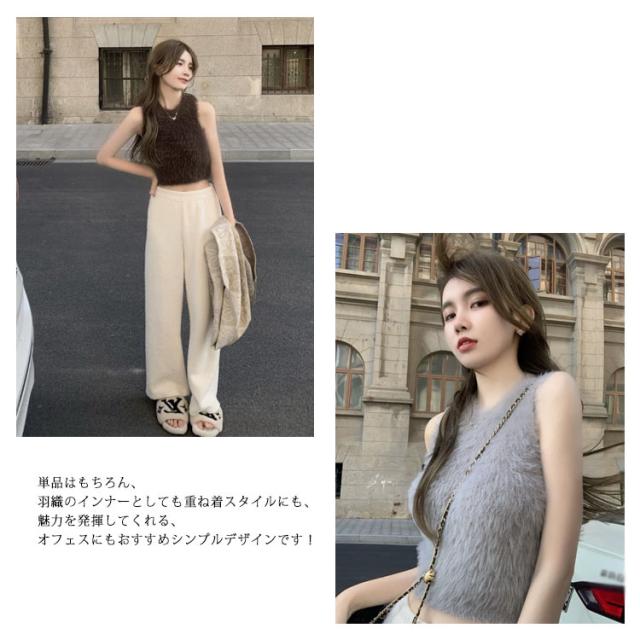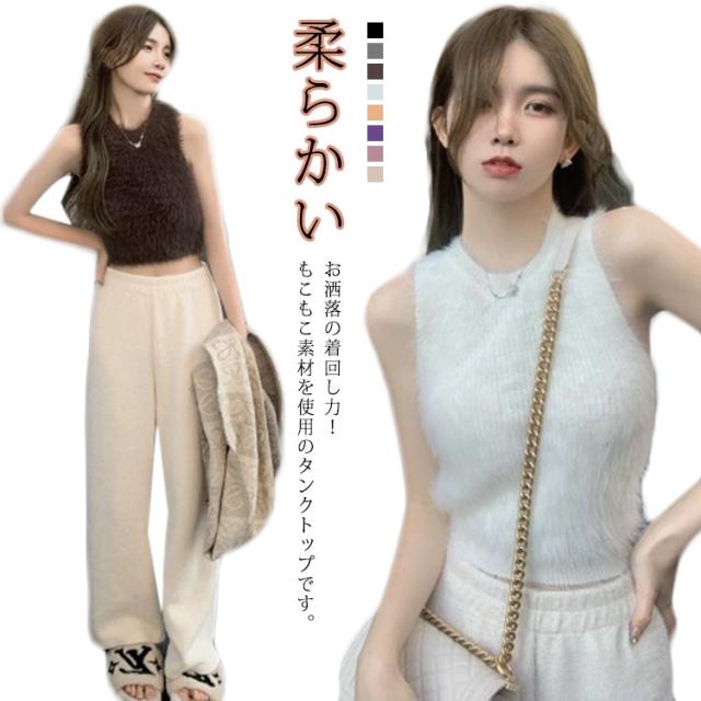 送料無料 タンクトップ レディース インナー キャミソール ノースリーブ トップス フェイクファー ミンク ふわふわ モコモコ レイヤード へそ出し 袖なし カットソー ダンス衣装 春 秋 ショート丈 おしゃれ かわいい S M L