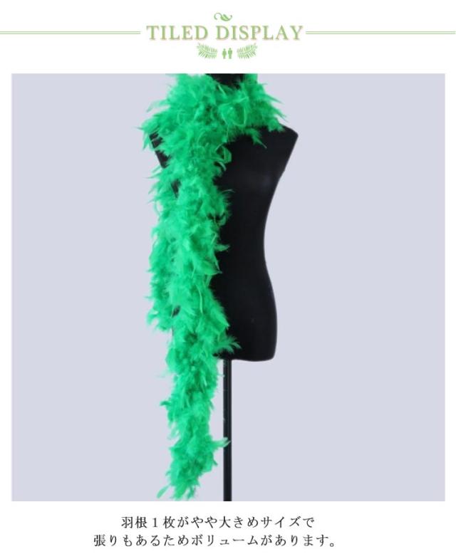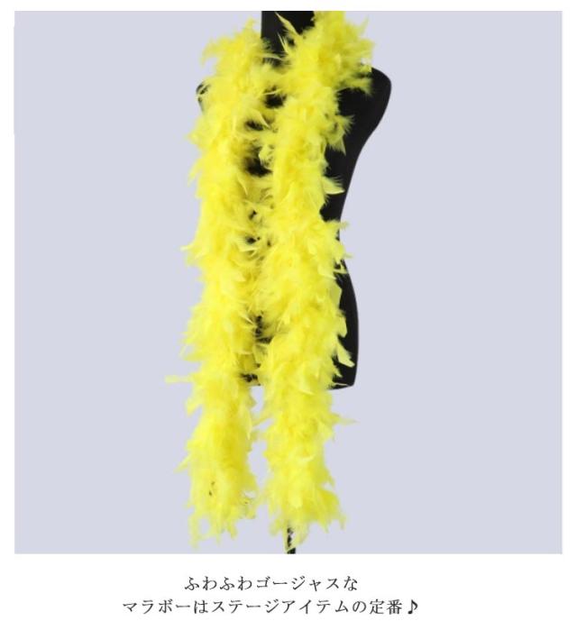 | ボリューム感がたっぷりあるゴージャスなマラボー。 羽根1枚がやや大きめサイズで張りもあるためボリュームがあります。 長さがあるので首に巻いたり、腕にかけたり様々な使い方ができます。 ふわふわゴージャスなマラボーはステージアイテムの定番♪ シンプルなドレスなどにプラスして華やかさをプラス出来ます。 | |