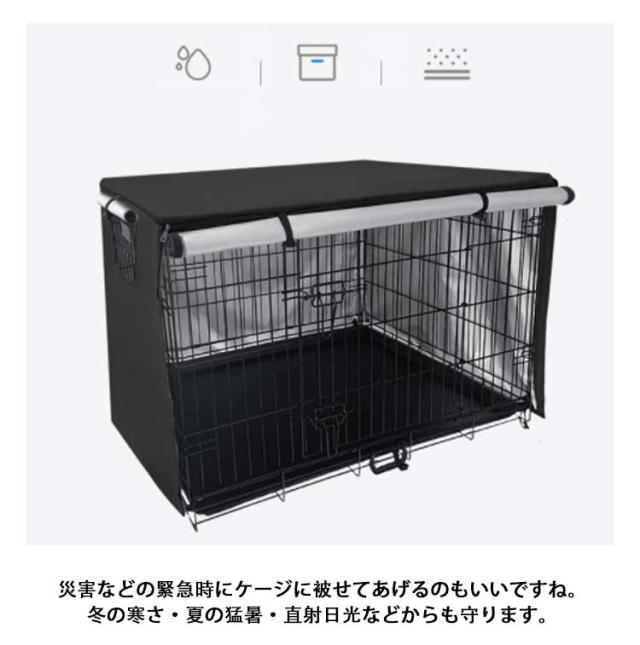 | ・お手持ちのペットケージの上にサッとかぶせるだけ! ・目隠しや保温、遮光効果のあるペット用ケージカバーです。 ・犬は本能的に、囲まれたうす暗い場所が落ち着くと言われています。 ・来客時に犬が無駄吠えをしたり落ち着きがない際や、寝るときなどにケージに被せることで、安心できるプライベート空間にしてあげることができます。 ・災害などの緊急時にケージに被せてあげるのもいいですね。 ・冬の寒さ・夏の猛暑・直射日光などからも守ります。 ・また、ペットの身体のためにも、直接冷暖房が当たらない様にしてあげることが大切です。 ・抜け毛が気になる季節には、ケージカバーをかぶせることで広範囲に散らばることを防ぎます。 ・正面のファスナーを開くと、入口面を巻き上げて固定することができます。 ・ケージの正面側を開けておくことで、ワンちゃんの出入りもスムーズに行えます。 ・また、左サイドにもロールアップして固定することができる小窓が付いています。 ・水を通しにくい素材を使用していますので、水にぬれてもサッとひと拭きで汚れを落とすことができます。突然の雨からもペットを守ります。 ・使わないときはコンパクトに折りたたむことができます。 | |
