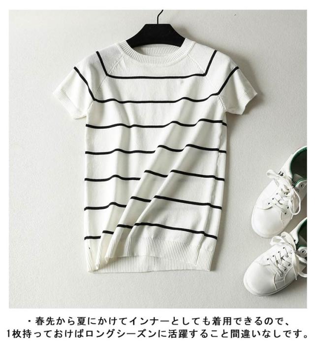 サマーニット Tシャツ 半袖 ボーダー レディース カットソー ニット セーター トップス カジュアル オフィス 女性 春夏 無地 ボーダー柄