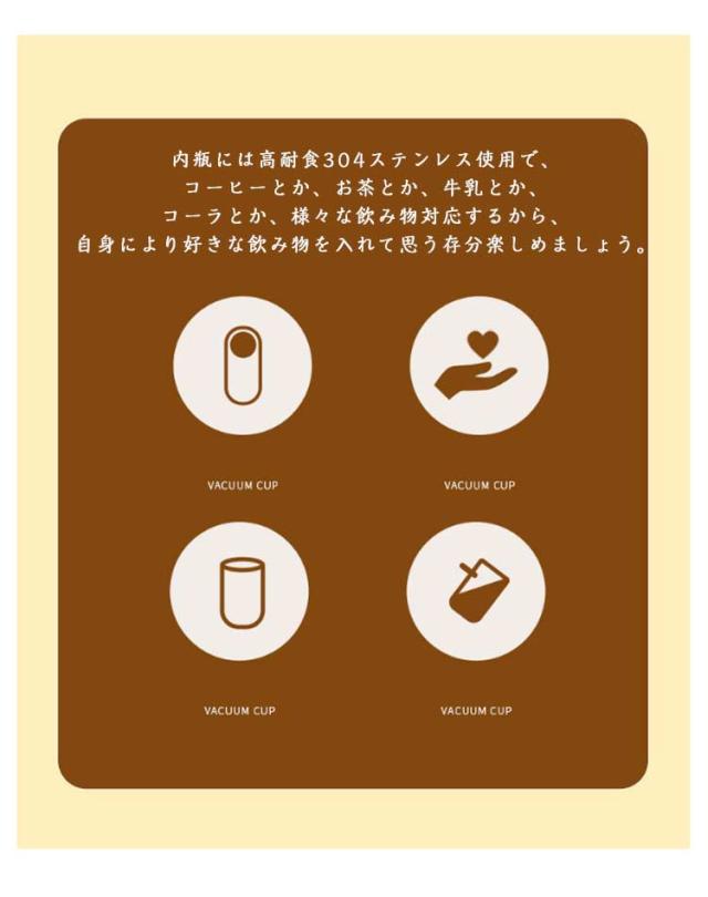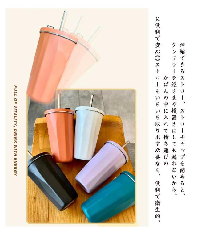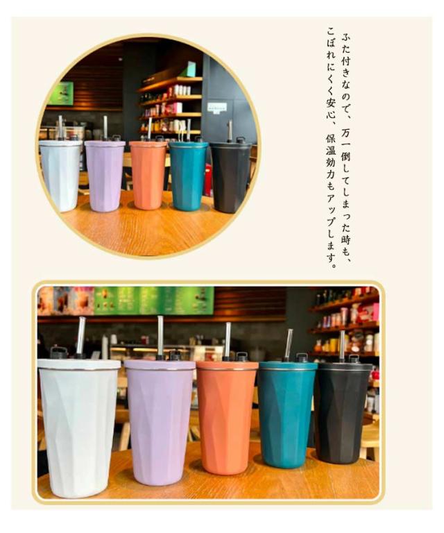 | ストローキャップを閉めるだけで、漏れことなく、どこへでも持ち運べます。 デザイン性も機能性も妥協しないストロー付きのステンレスタンブラー。 カフェ風のオシャレなデザインに一目惚れ!デザイン性も機能性も抜群のステンレスタンブラー。 伸縮できるストロー、ストローキャップを閉めると、タンブラーを逆さまや横置きにしても漏れないから、かばんの中に入れて持ち運びのに便利で安心◎ストローもいちいち取り出す必要なく、便利で衛生的。 内瓶には高耐食304ステンレス使用で、コーヒーとか、お茶とか、牛乳とか、コーラとか、様々な飲み物対応するから、自身により好きな飲み物を入れて思う存分楽しめましょう。 真空二重構造で冷たい飲み物、温かい飲み物も美味しい温度をキープしてくれます。オールシーズン使えるのも嬉しいポイントです。 ストロー付きタンブラーは目線を下げずに飲み物をのむことができるので、オフィスシーンやデスクワークに最適です。容量はお好きなドリンクをたっぷり楽しめる600mlです。 ふた付きなので、万一倒してしまった時も、こぼれにくく安心、保温効力もアップします。 | |