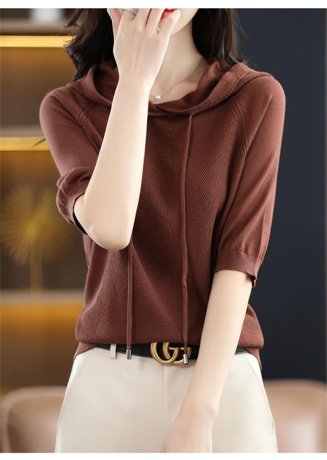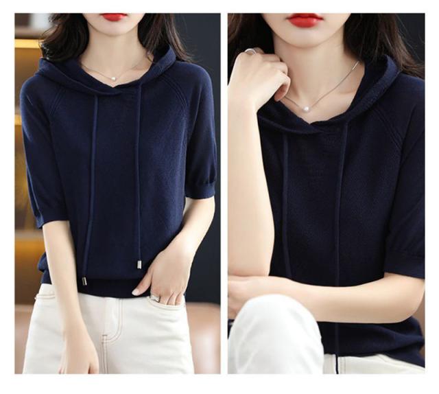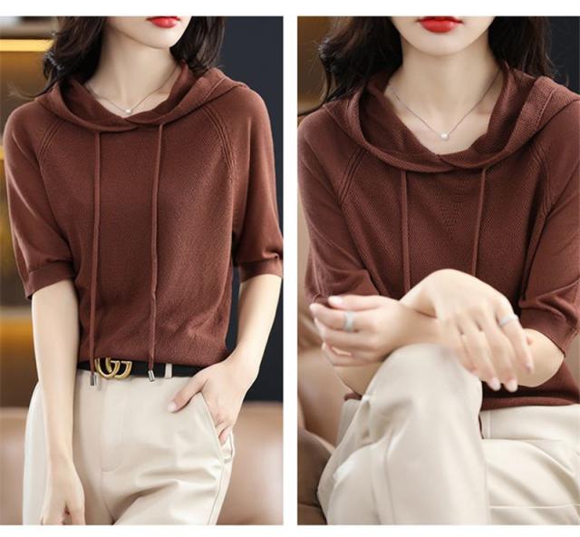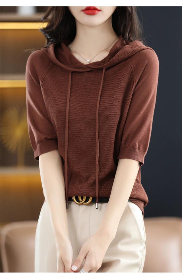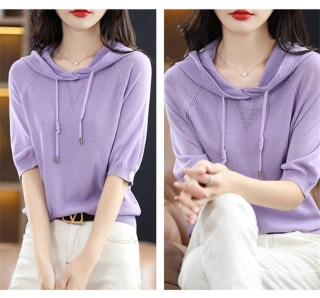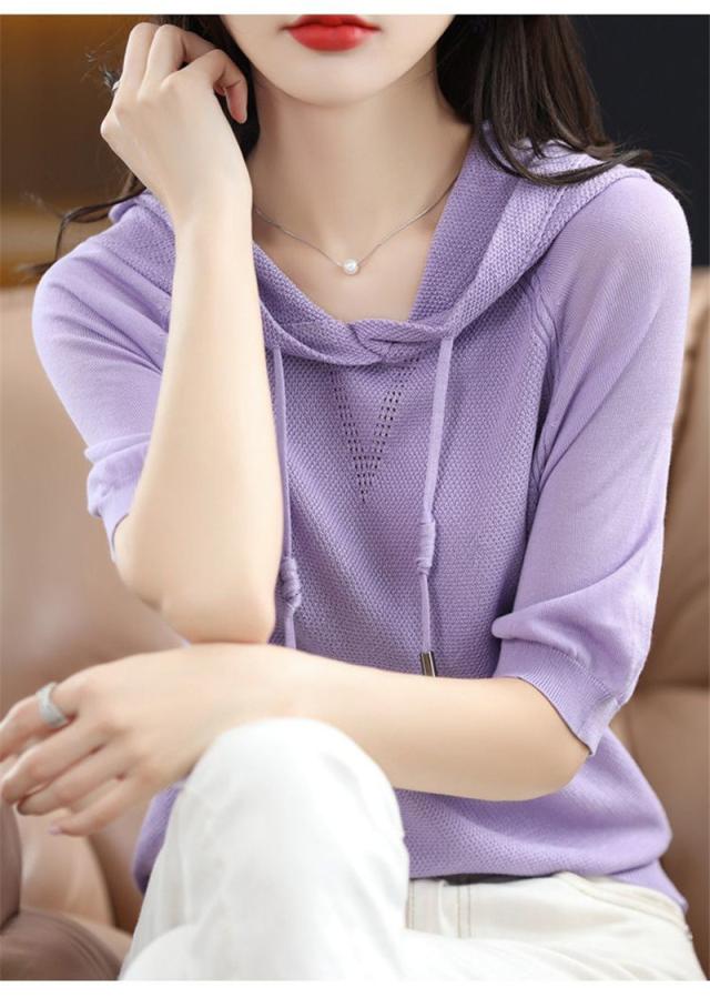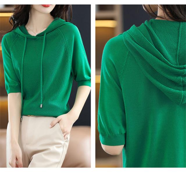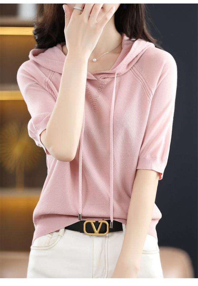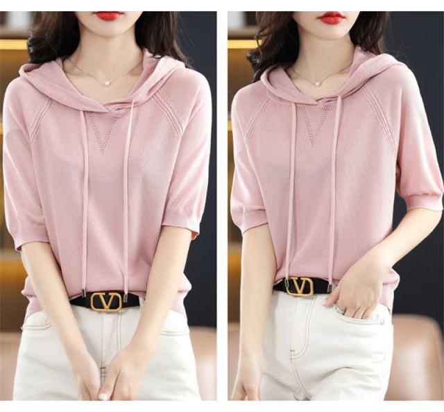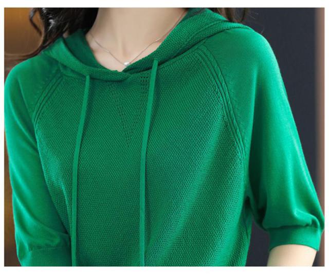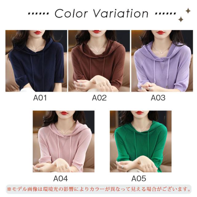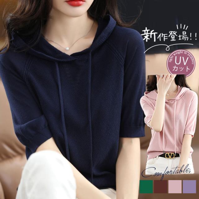 半袖パーカー レディース ニットパーカー 五分袖 フード付き ゆったり UVカット Tシャツ カジュアル トップス プルオーバー