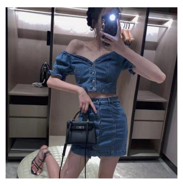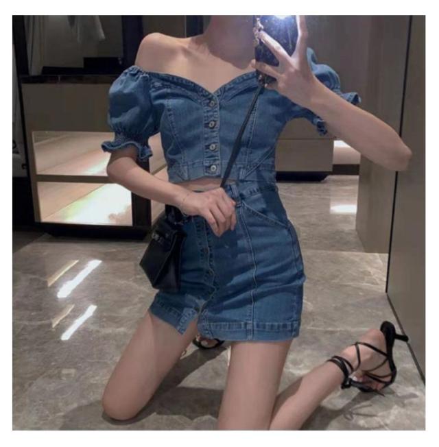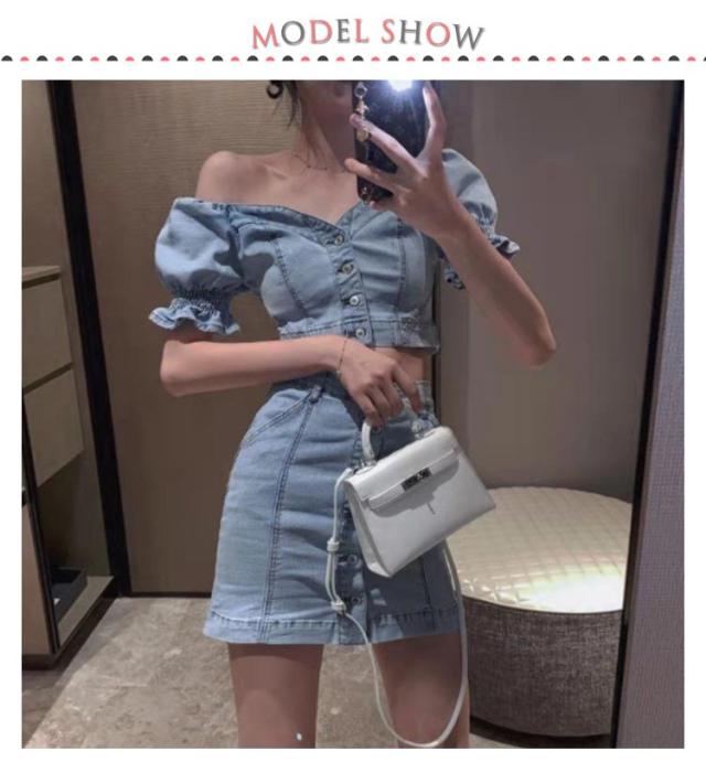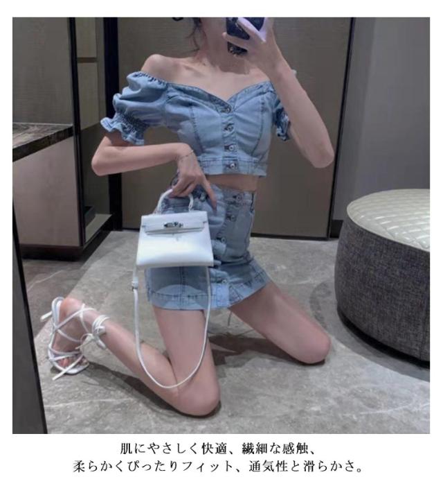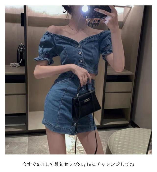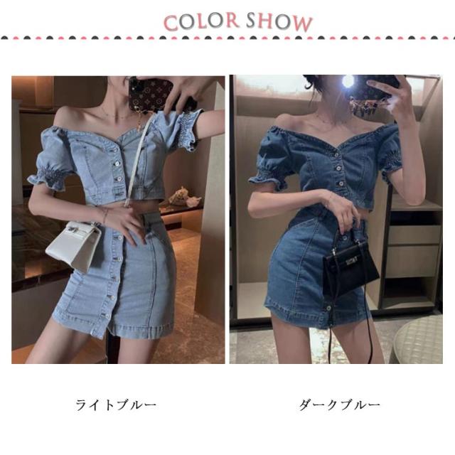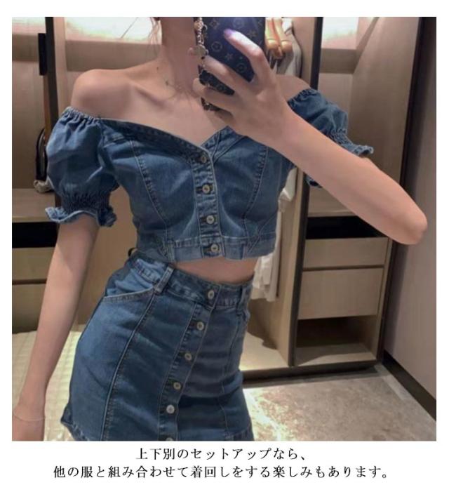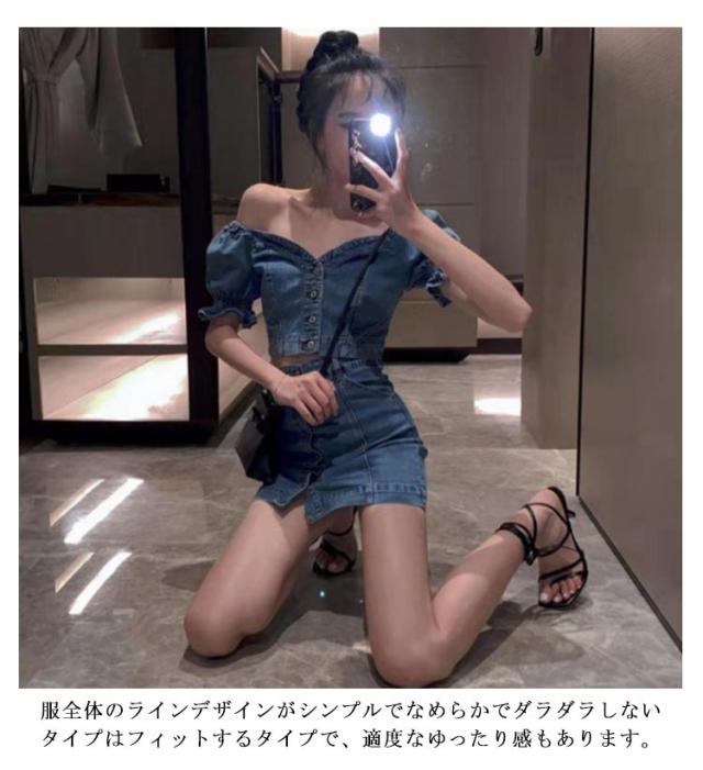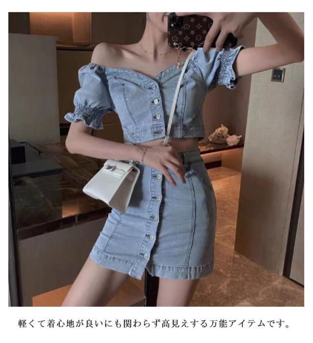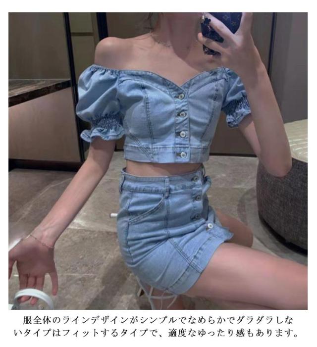 デニムスカートセット 夏 半袖 ブラウス デニム パフスリーブ レディース セットアップ タイトスカート ぽわん袖 ハイウエスト トップス スカート ボトムス レディース ボトムス スタイルアップ 着痩せ 美シルエット カジュアル 脚長効果 送料無料