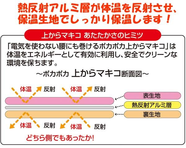 さむ〜い冬は普段着の上にもう1枚!!熱反射アルミ層が体温を反射させ、保温生地でしっかり保温します!!裏面ファスナー部分に折りたたんで収納すれば、クッションに!! |