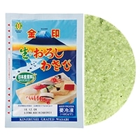 香りに優れた本わさびと辛味に優れた西洋わさび(弊社開発系統『白宝』)を独自の配合でブレンドし、おろしたての風味・辛味をそのままに凍結パックした生おろしわさびです。目が細かく、本来のわさびの香り・辛味をより一層お楽しみいただけます。手乗りがよく、お寿司などに最適です。