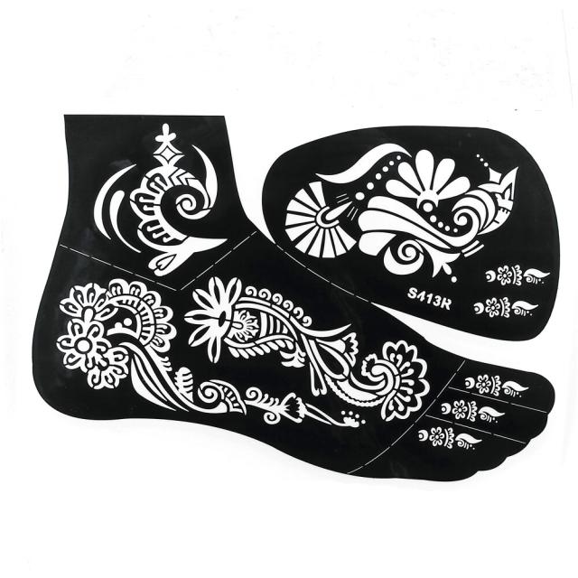 足の甲にフェイクタトゥーを簡単に描けるヘナタトゥー用のステンシルシートステッカーです。