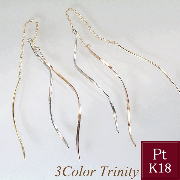 大人の揺れるトリニティピアス。最もこだわったのは、素材。プラチナ900、K18ピンクゴールド、K18ゴールドという、上質素材。この輝き、上品な美しさにうっとり!3色のカラーの効果で、どんなコーディネートにもフィットします。