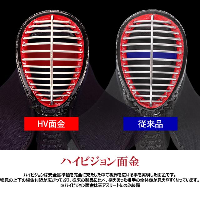 選ばれ続けてきた天印防具 毎日稽古する競技者が何年も使用できるように考え、 こだわった耐久性能にシンプルな見た目。 そしてヘリや顎に紺鹿革を使用し、打突の安全性も考慮した設計。 さらに「ハイビジョン面金」を装備し最高の使用感を演出します。 ハイビジョンは安全基準値を完全に充たした中で視界を広げる事を実現した面金です。 従来の製品に比べ、構えあった相手の全体像が見えやすくなっています。 |