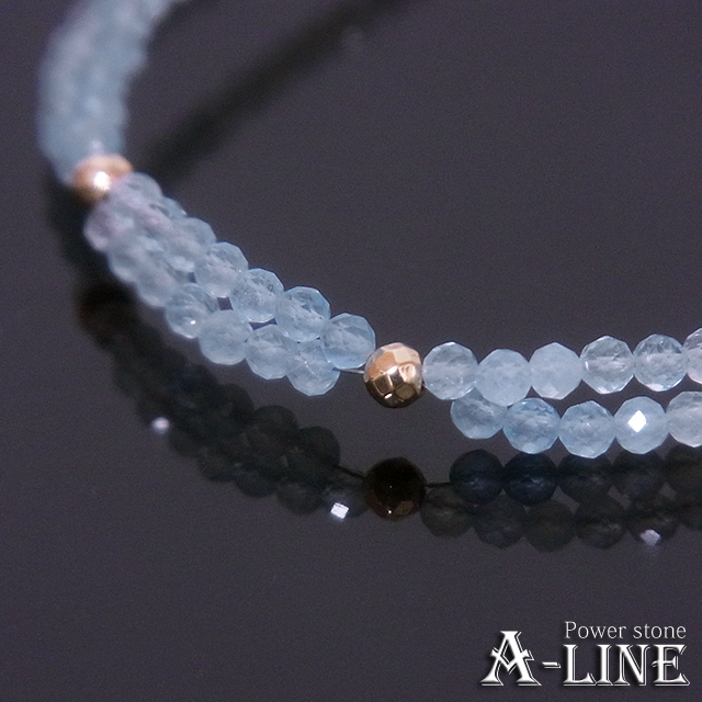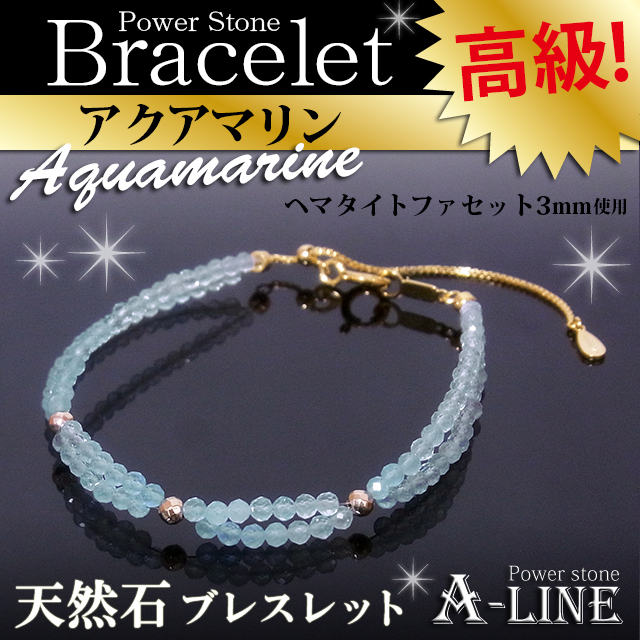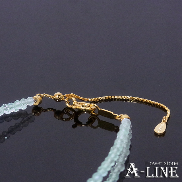 アクアマリン・ファセット2.5mm、ヘマタイト・ファセット(コーティング)金色3mm、SILVER925ひき輪&スライドアジャスター金色、形状記憶超弾性ワイヤー、ワンプッシュ