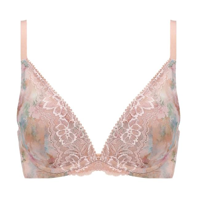 水彩画調のプリントチュールに繊細な編みレースを重ねて淡雲の空模様を表現。編みレースをカップから肩先に向かってあしらったレーシーなデザインです。