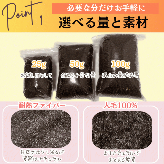 | 素材 | 人毛 / 人毛様耐熱ファイバー(耐熱温度180℃) (全2種) |