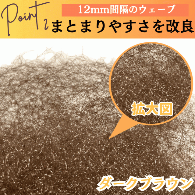 | 人毛様耐熱ファイバー | 耐熱ファイバーですので、約180℃までの耐熱性能。約12mm間隔のウェーブにすることでまとまりやすさ、崩れにくさを改良 |